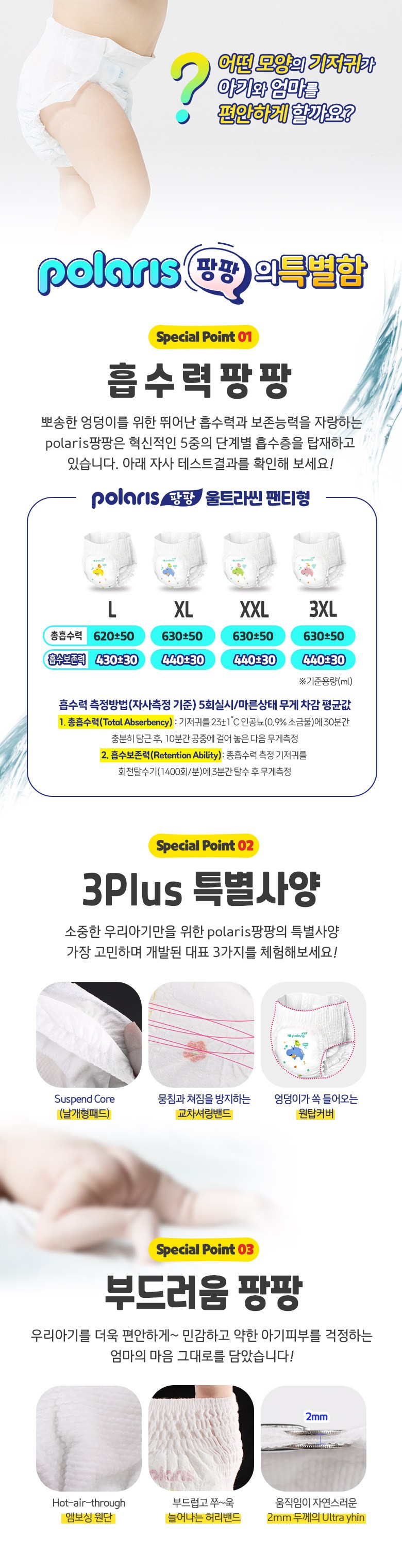 | 색상 | 하얀색 | 재질 | 안감(기저귀): 부직포(폴리프로필렌,폴리에틸렌,탄산칼슘),고무줄(이산화티타늄,폴리디메틸실록산,폴리우레탄)/흡수층(기저귀):고분자흡수층(폴리아크릴산나트륨),펄프,폴리프로필렌방수층(기저귀): 폴리에필렌필름,폴리에틸렌,탄산칼슘,색소(기저귀방수층)/접착제:미네랄오일,합성고무,탄화수소 수지/테이프:폴리프로필렌,천연고무,탄화수소 수지,색소(하늘색) |