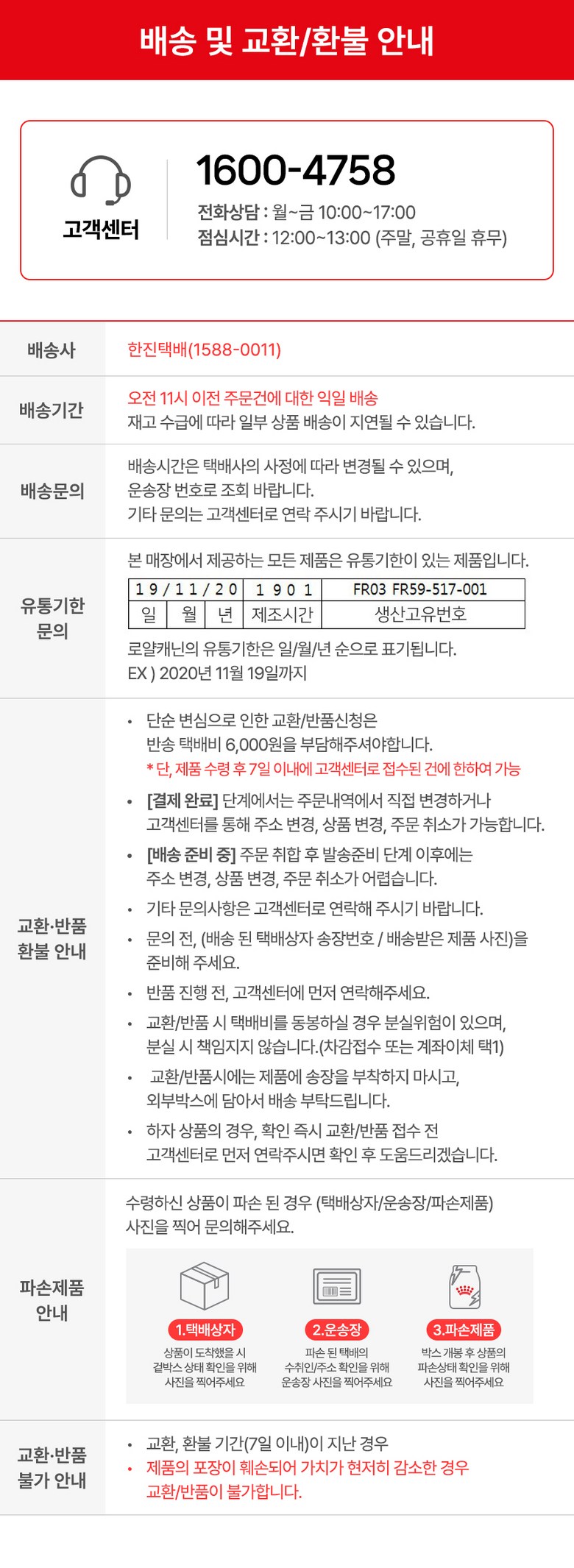 | 교환/반품 신청 기준일 | ㆍ단순변심에 의한 교환/반품은 제품 수령 후 7일 이내까지, 교환/반품 제한사항에 해당하지 않는 경우에만 가능 (배송비용과 교환/반품 비용 왕복배송비 고객부담) ㆍ상품의 내용이 표시·광고의 내용과 다른 경우에는 상품을 수령한 날부터 3개월 이내, 그 사실을 안 날 또는 알 수 있었던 날부터 |