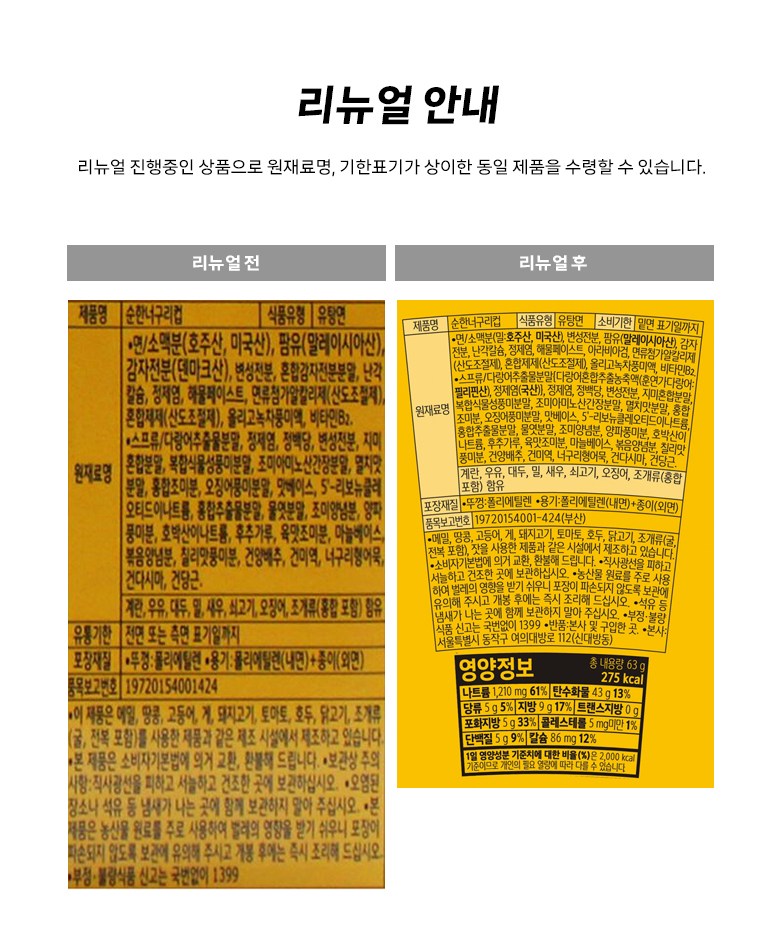 | 포장단위별 내용물의 용량(중량), 수량 | 63g*6개 | 원재료명 및 함량 | 리뉴얼전: 컨텐츠 참조 /리뉴얼후: 컨텐츠 참조 |