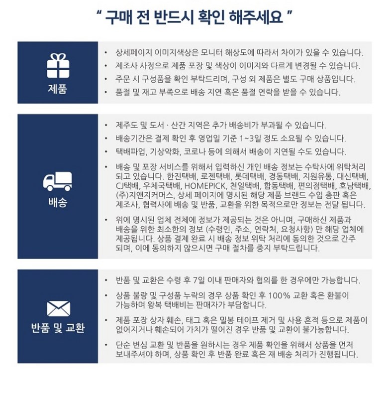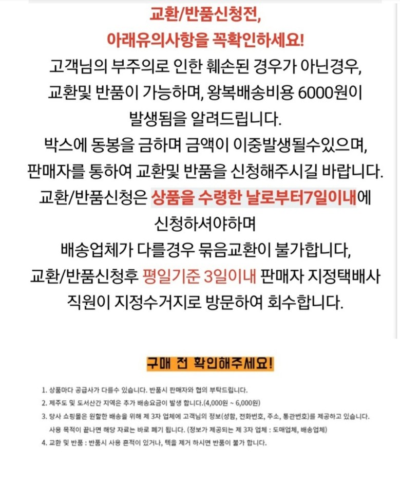 - ㆍ교환/반품에 관한 일반적인 사항은 판매자가 제시사항보다 관계법령이 우선합니다.