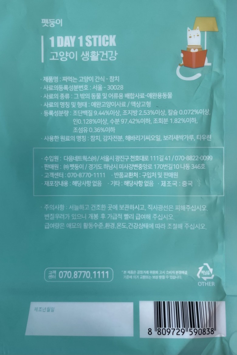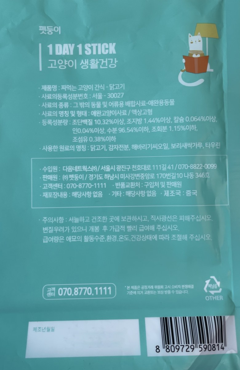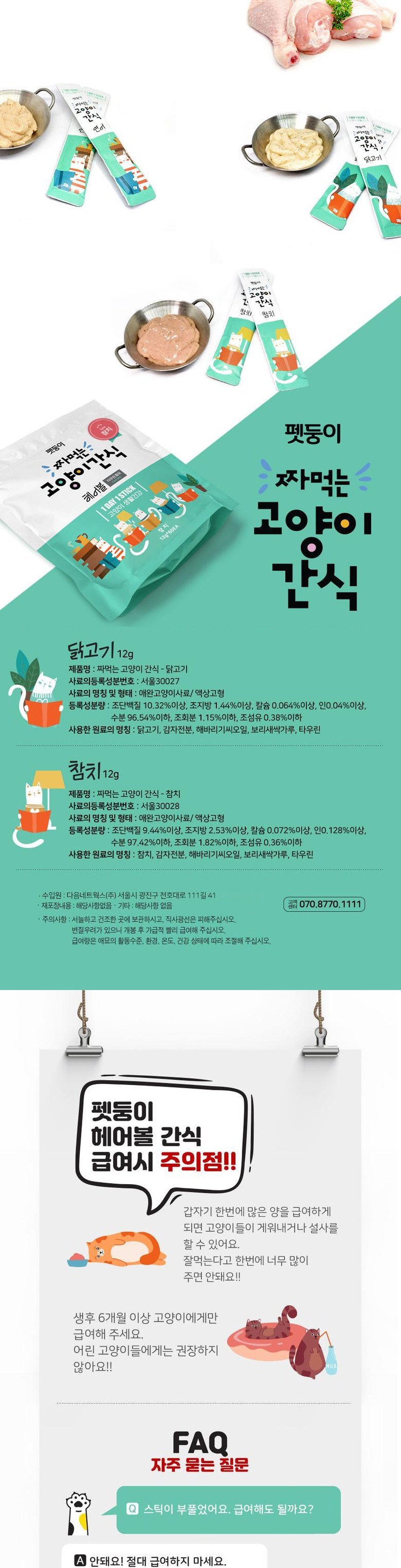 | 품명 및 모델명 | 짜먹는 고양이 간식 닭고기, 참치 | 인증/허가 사항 | 사료관리법에 따른 성분등록번호 : 컨텐츠 참조 |