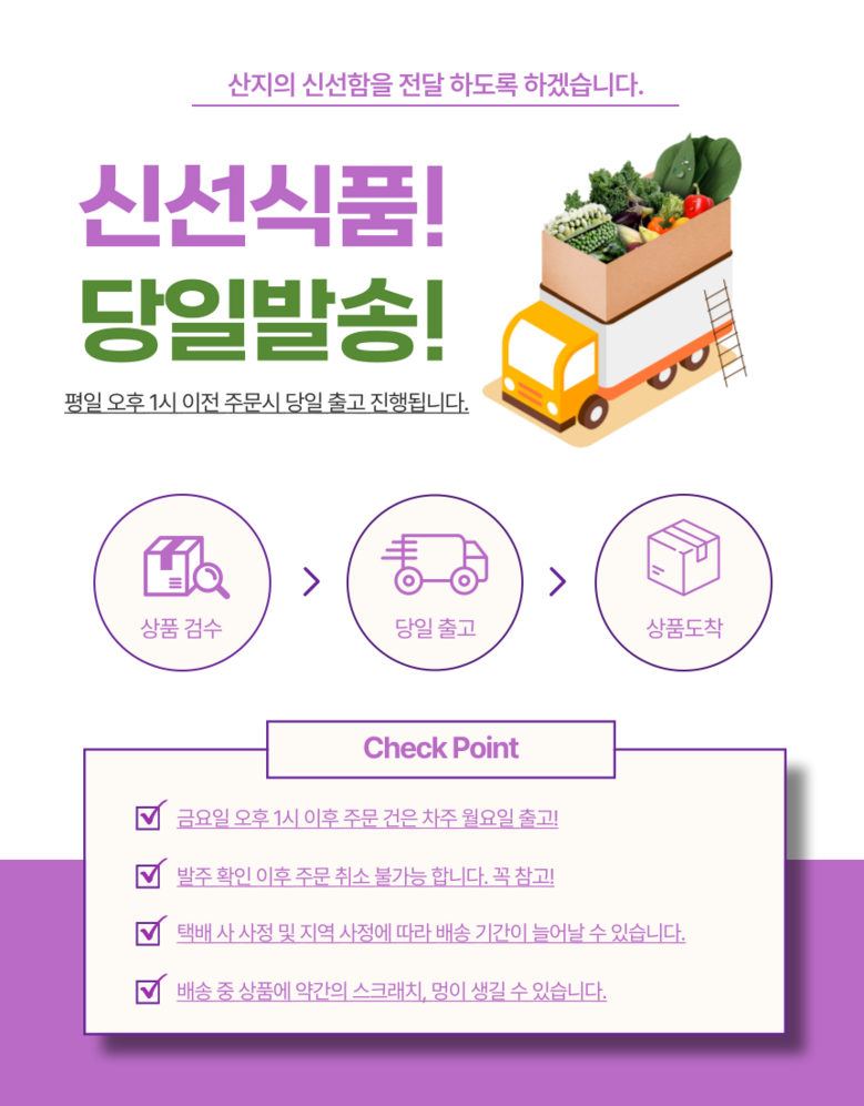 | 배송방법 | 신선/냉장/냉동 | 배송비 | 무료배송 - 도서산간 지역 배송불가 |