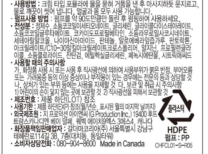 | 화장품제조업자, 화장품책임판매업자 및 맞춤형화장품판매업자 | 컨텐츠 참조 | 제조국 | 캐나다 |