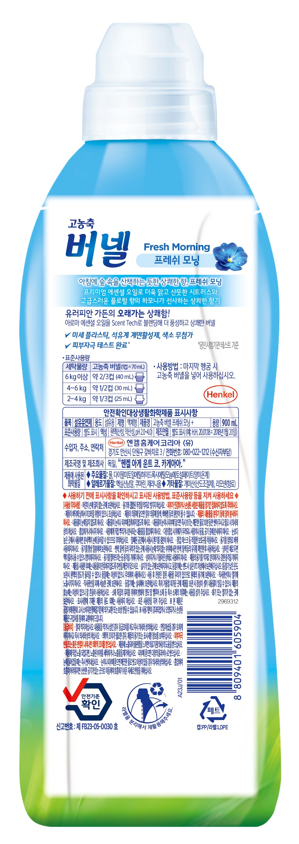 | 품목 및 제품명 | 섬유유연제 /고농축 버넬 프레쉬 모닝 + | 용도(표백제의 경우 계열을 함께표시) 및 제형 | 섬유용 / 액체형 |