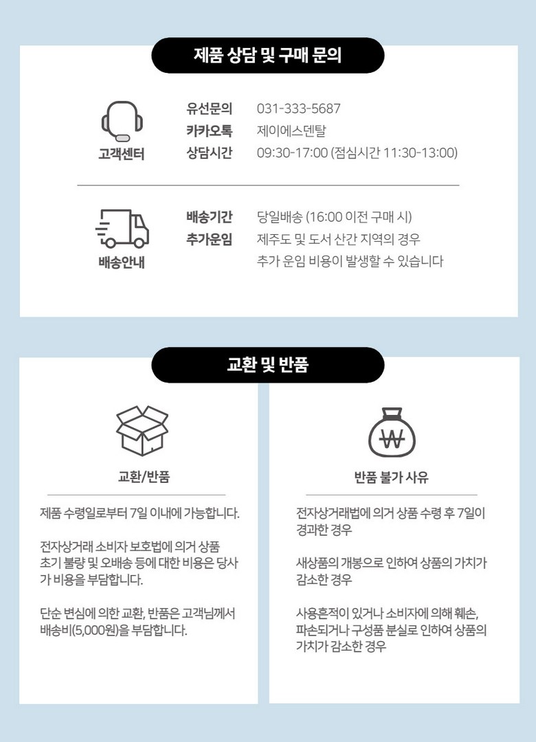 | 교환/반품 신청 기준일 | ㆍ단순변심에 의한 교환/반품은 제품 수령 후 7일 이내까지, 교환/반품 제한사항에 해당하지 않는 경우에만 가능 (배송비용과 교환/반품 비용 왕복배송비 고객부담) ㆍ상품의 내용이 표시·광고의 내용과 다른 경우에는 상품을 수령한 날부터 3개월 이내, 그 사실을 안 날 또는 알 수 있었던 날부터 |