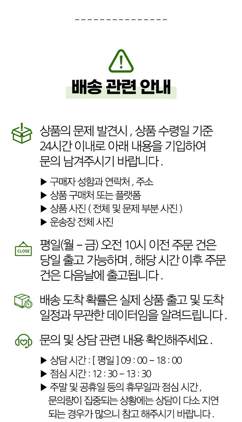 - ㆍ모니터 해상도의 차이로 인해 색상이나 이미지가 실제와 달라, 고객이 단순 변심으로 교환/반품을 무료로 요청하는 경우