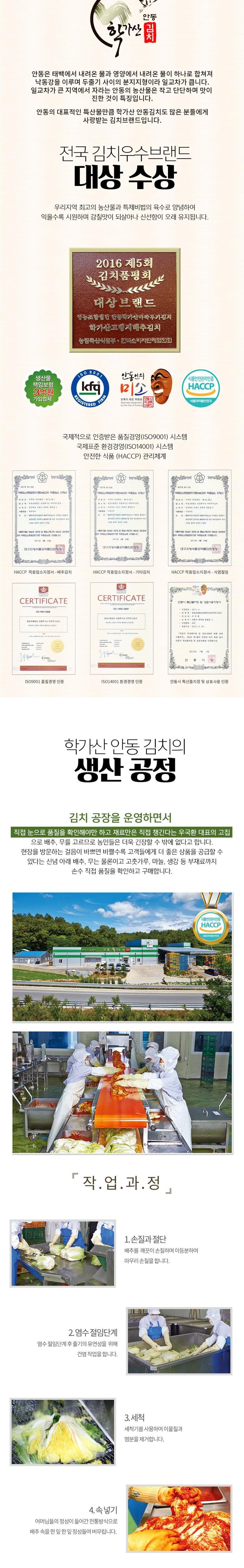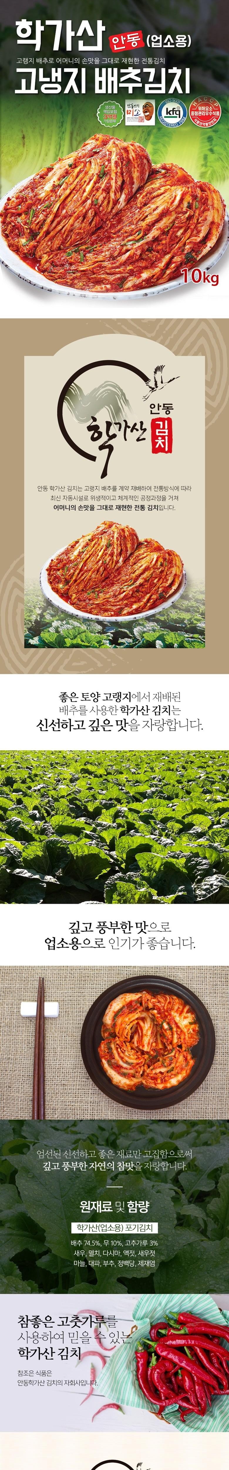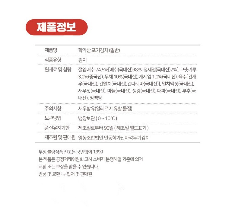 | 품목 또는 명칭 | 안동학가산김치 | 포장단위별 내용물의 용량(중량),수량,크기 | 안동학가산 일반포기김치 5kg /10kg 수량:1박스 |