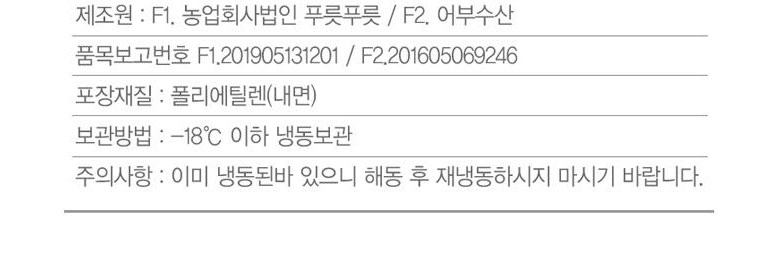 | 배송방법 | 신선/냉장/냉동 | 배송비 | 무료배송 - 도서산간 지역 배송불가 |