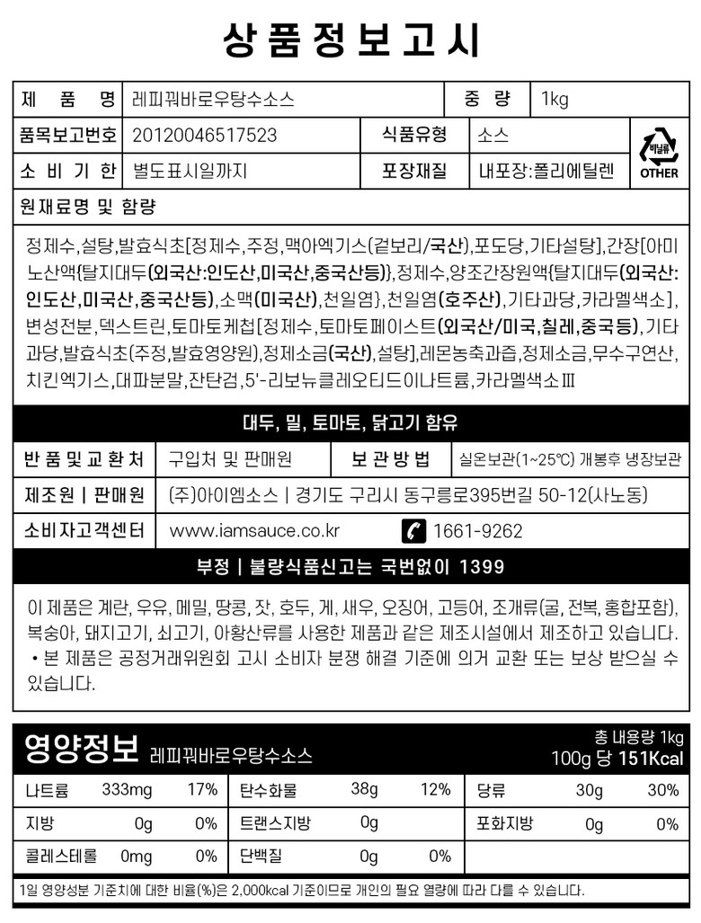 | 생산자 및 소재지 | 아이엠소스 / 경기도 구리시 동구릉로 395번길 50-12 (사노동) / www.iamsauce.co.kr | 제조연월일, 소비기한 또는 품질유지기한 | 소비기한(또는 유통기한) : 2026년 10월 11일 이거나 그 이후인 상품 제조년월일 : 2026년 01월 15일 이후인 제조상품 |