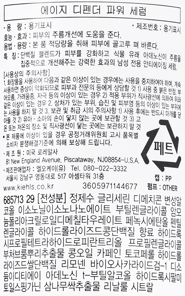 | 사용기한 또는 개봉 후 사용기간 | 제조일부터 3년. 공급사 사정에 따라 제조일자가 다른 상품이 입고되어 정확한 제조년월일 및 사용기한 확인이 어렵습니다. 제조년월일 확인이 어려운 상품은 유통기한을 기준으로 배송되므로 구매 시 유통기한을 참고 부탁드립니다. | 사용방법 | 에이지 디펜더 파워 세럼을 얼굴 전체에 부드럽게 펴 바른 다음, 중지와 약지를 이용해 볼을 중심으로 가볍게 눌러 흡수시켜 주세요. |