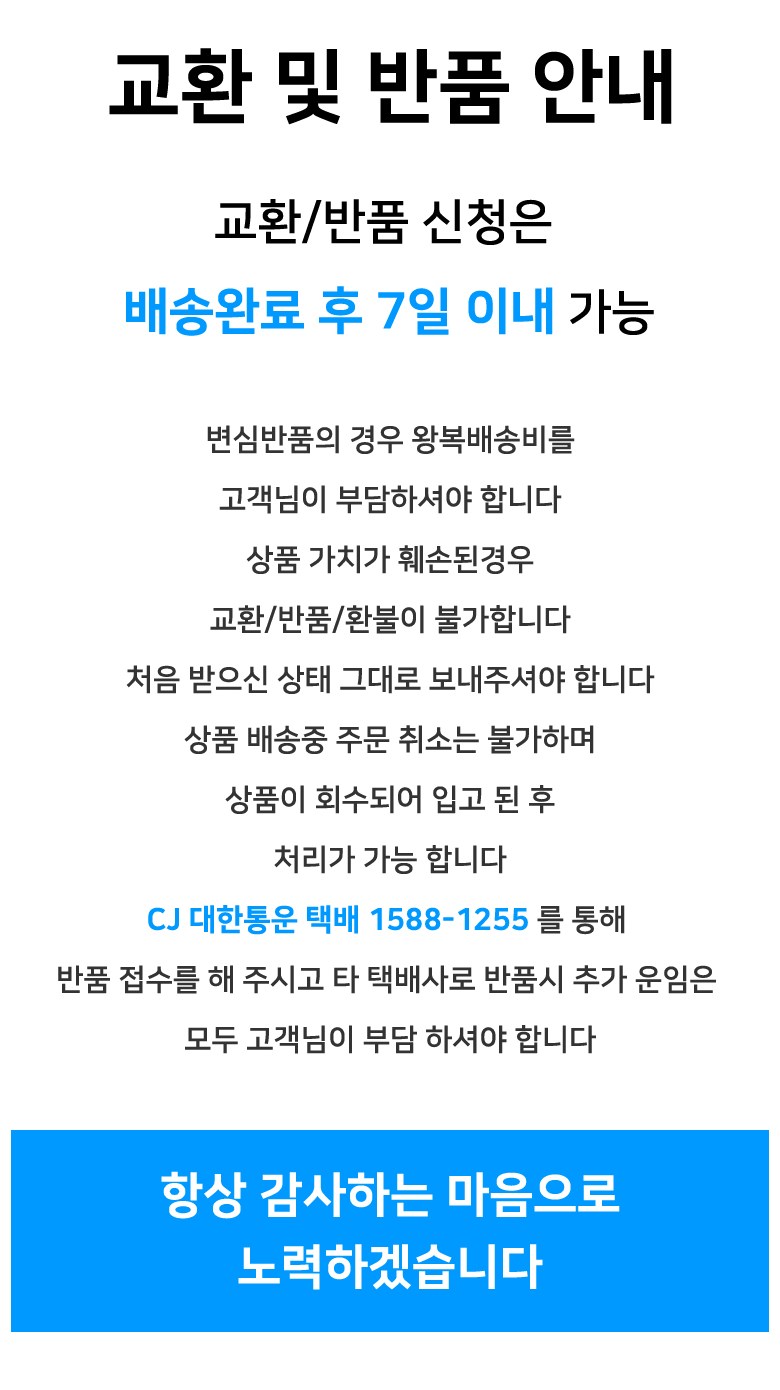 | 교환/반품 신청 기준일 | ㆍ단순변심에 의한 교환/반품은 제품 수령 후 7일 이내까지, 교환/반품 제한사항에 해당하지 않는 경우에만 가능 (배송비용과 교환/반품 비용 왕복배송비 고객부담) ㆍ상품의 내용이 표시·광고의 내용과 다른 경우에는 상품을 수령한 날부터 3개월 이내, 그 사실을 안 날 또는 알 수 있었던 날부터 |