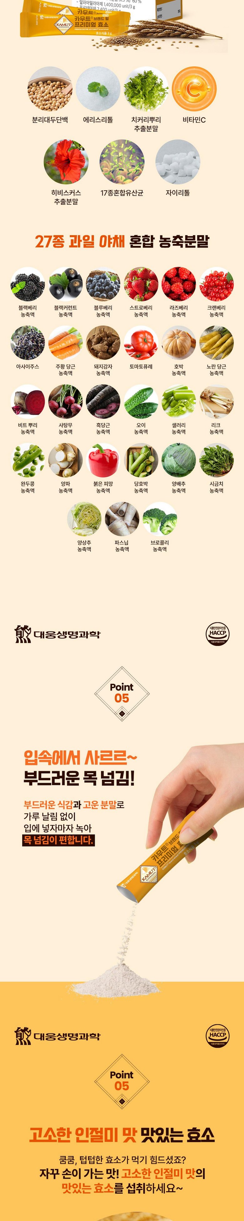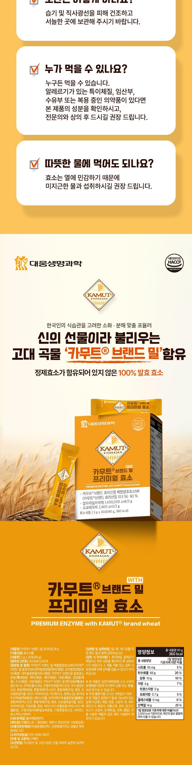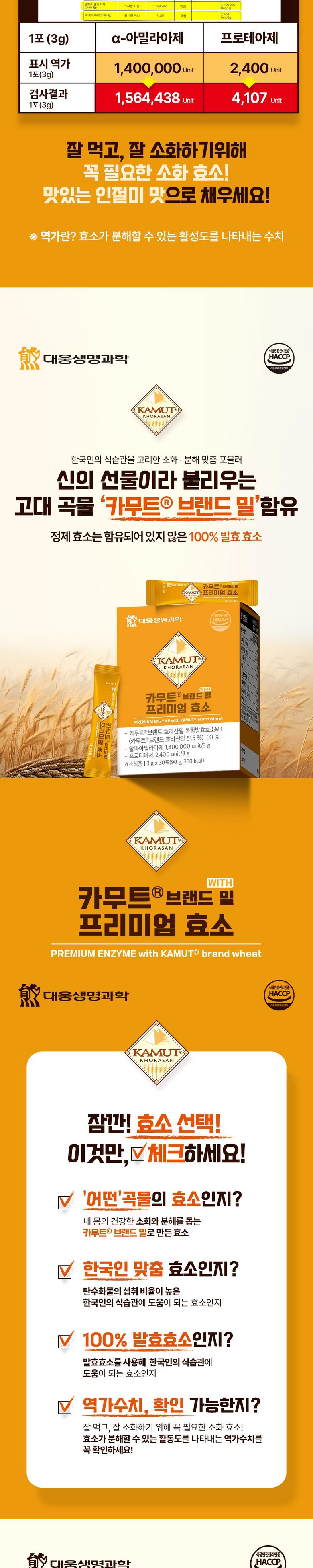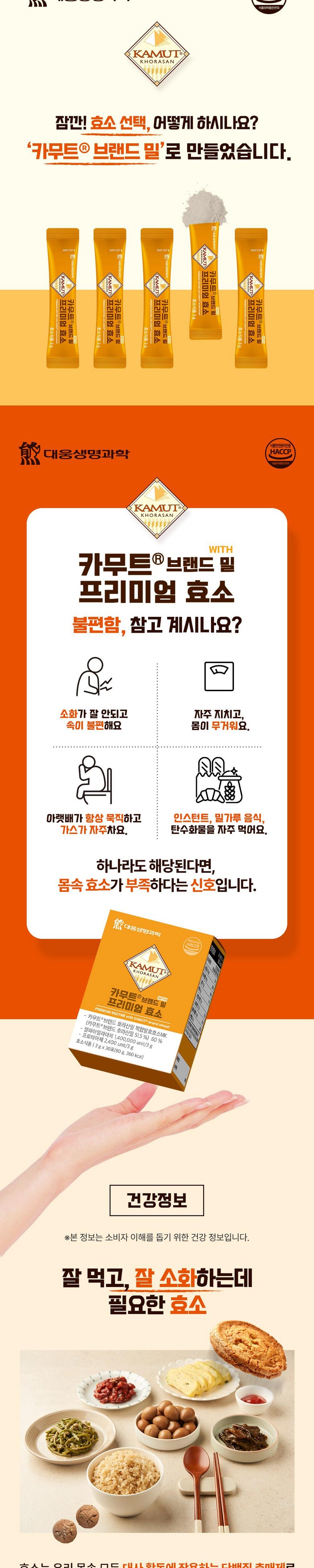 | 제품명 | 카무트R 브랜드 밀 프리미엄 효소 | 식품의 유형 | 효소식품 |
