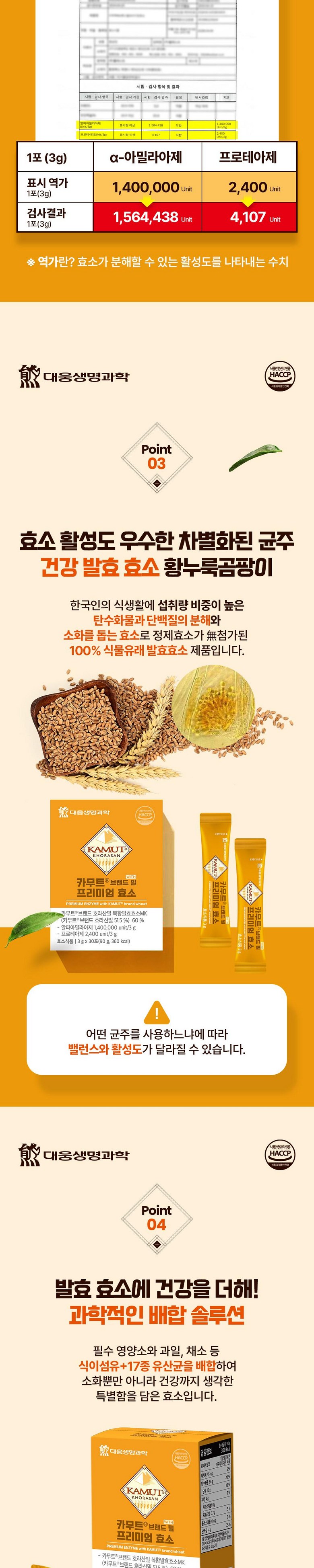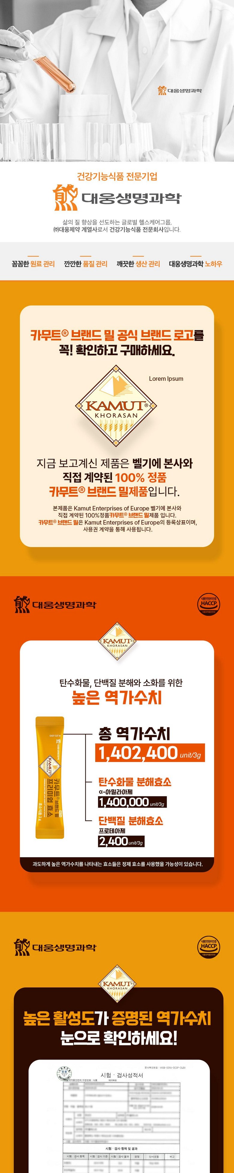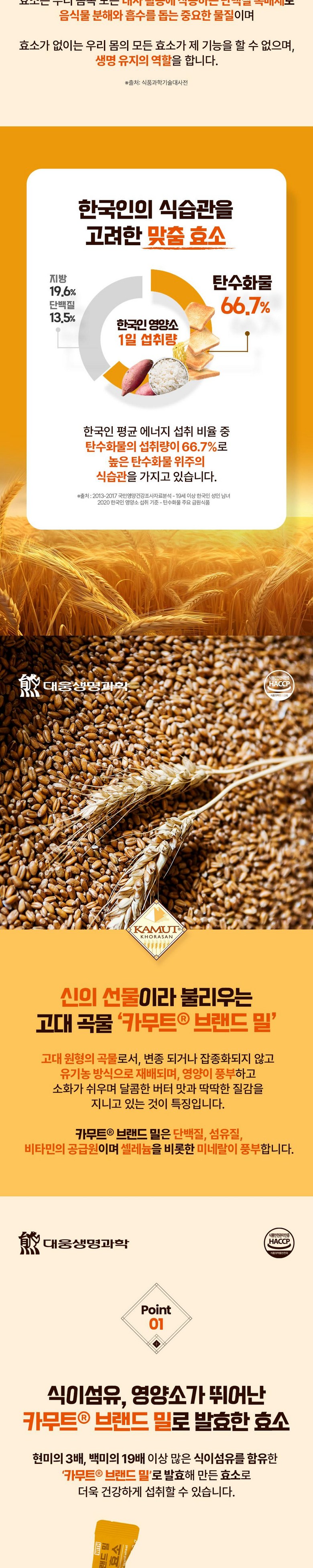 | 제품명 | 카무트R 브랜드 밀 프리미엄 효소 | 식품의 유형 | 효소식품 |