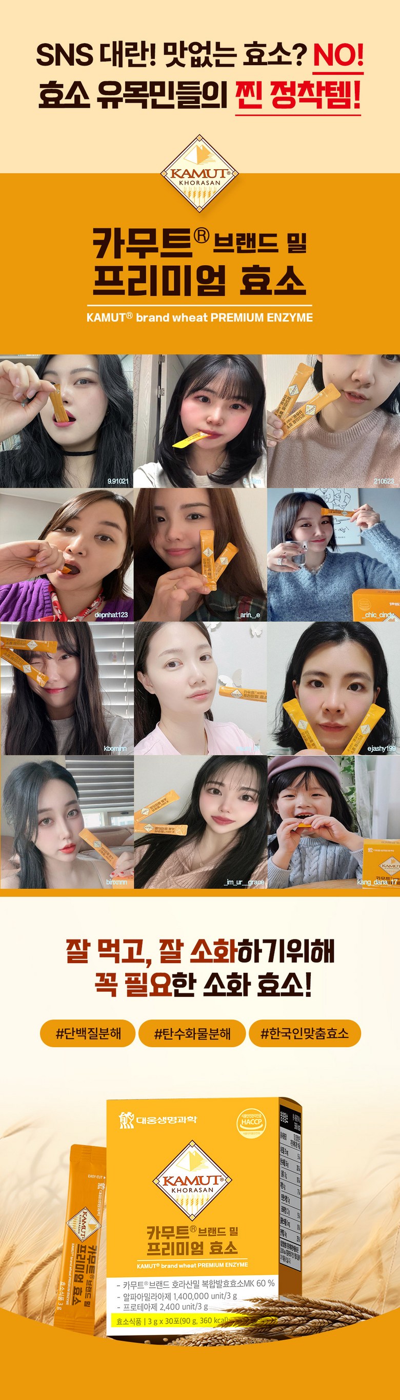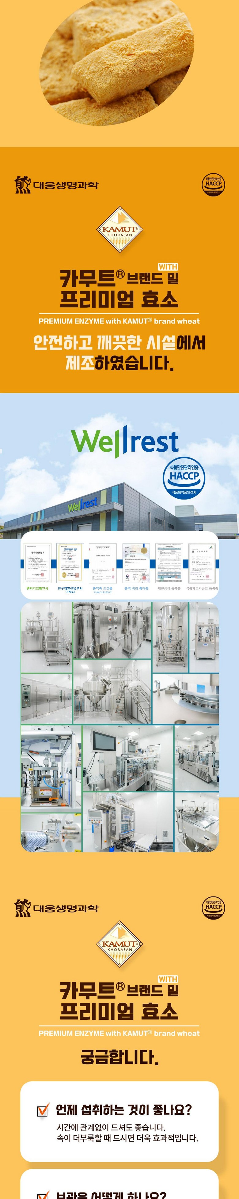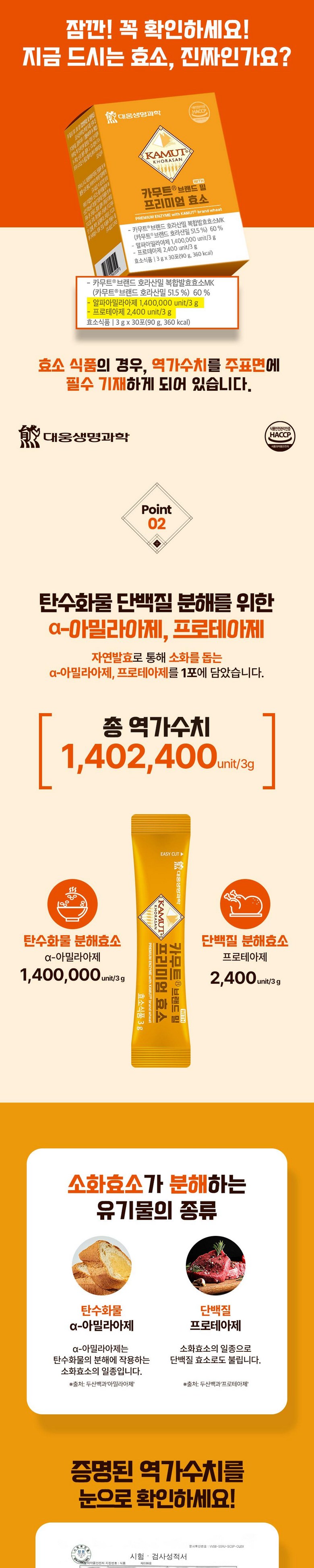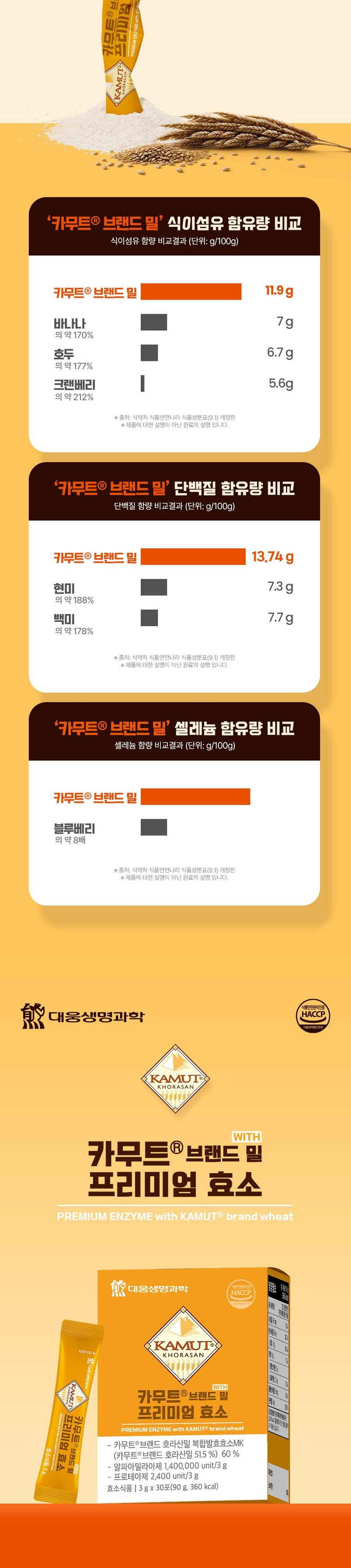 | 제품명 | 카무트R 브랜드 밀 프리미엄 효소 | 식품의 유형 | 효소식품 |