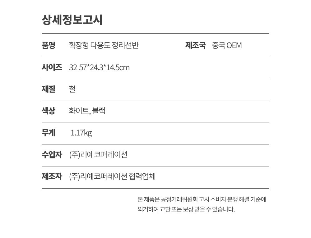 | 품명 및 모델명 | 확장형 다용도 정리 선반 | 재질 | 철 |