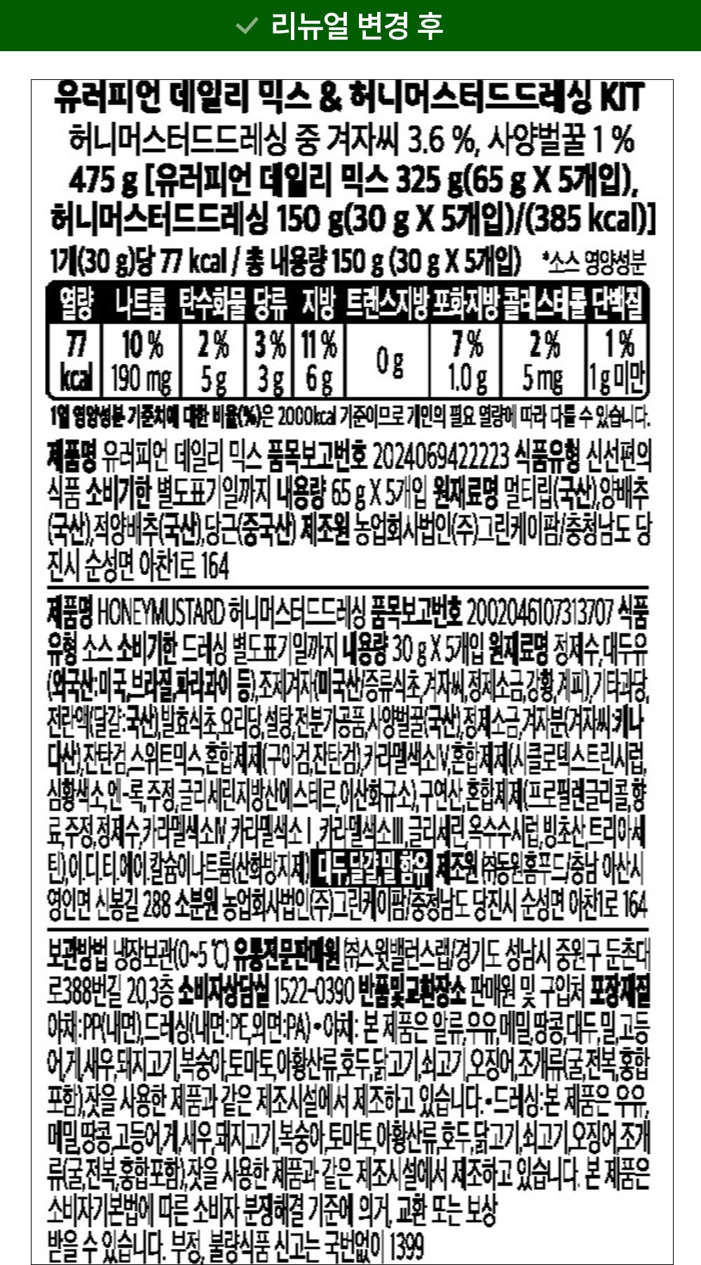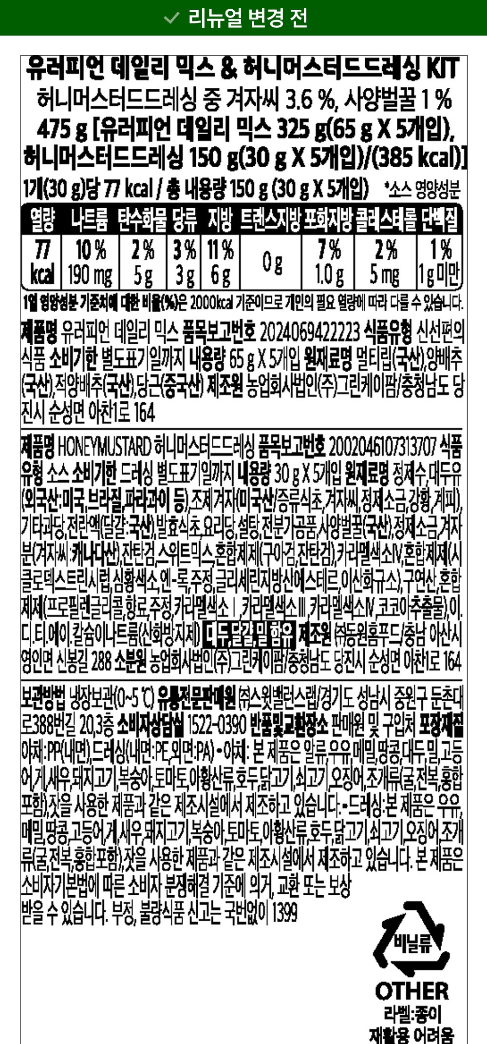 | 포장단위별 내용물의 용량(중량), 수량 | 475g(데일리믹스 325g + 드레싱 150g) x 4개 | 원재료명 및 함량 | 컨텐츠 참조 |
