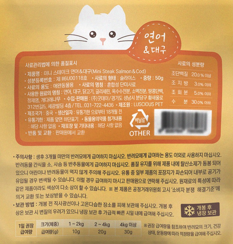 | 품명 및 모델명 | 미니 스테이크 연어&대구(Mini Steak Salmon&Cod) | 인증사항 | 사료관리법에 따른 성분등록번호 : 컨텐츠 참조 |