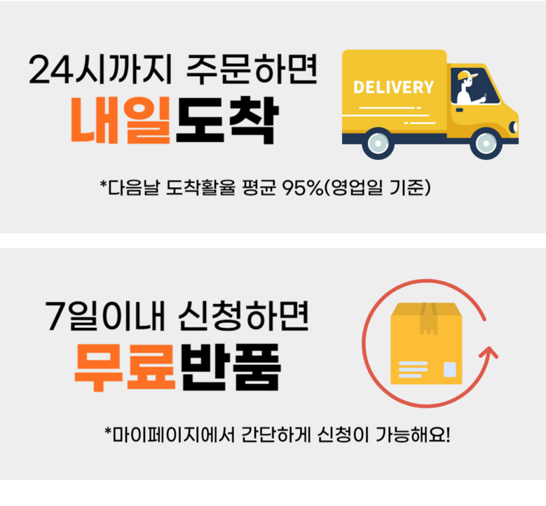 | 교환/반품 신청 기준일 | ㆍ단순변심에 의한 로켓배송 상품의 교환/반품은 제품 수령 후 30일 이내까지, 교환/반품 제한사항에 해당하지 않는 경우에만 가능 (교환/반품 비용 고객부담) ㆍ상품의 내용이 표시·광고의 내용과 다른 경우에는 상품을 수령한 날부터 3개월 이내, 그 사실을 안 날 또는 알 수 있었던 날부터 |