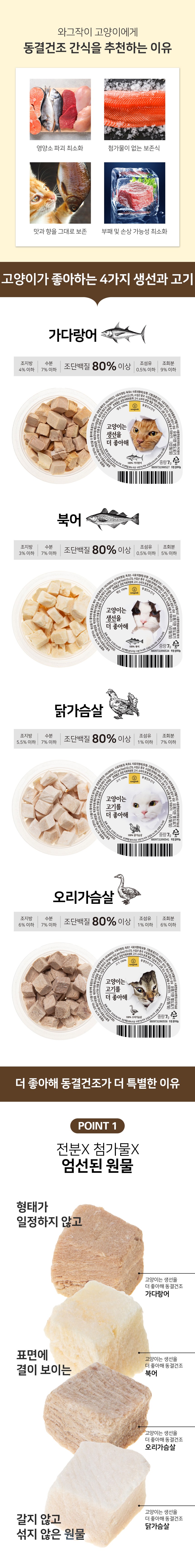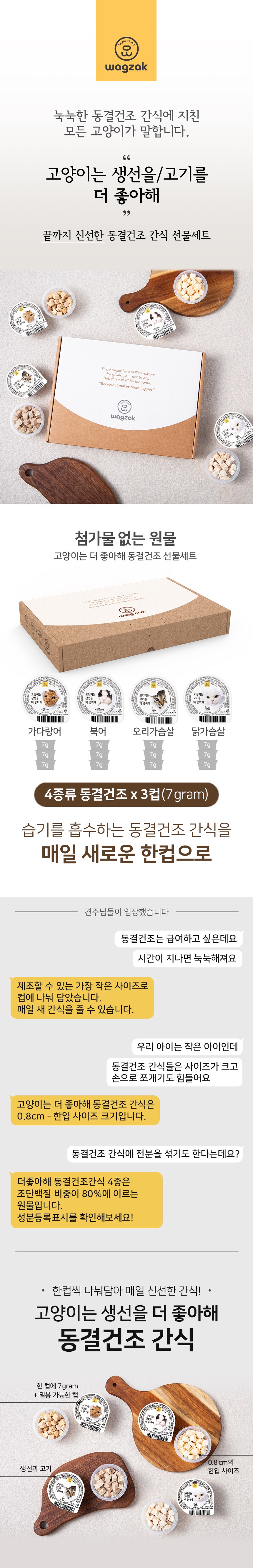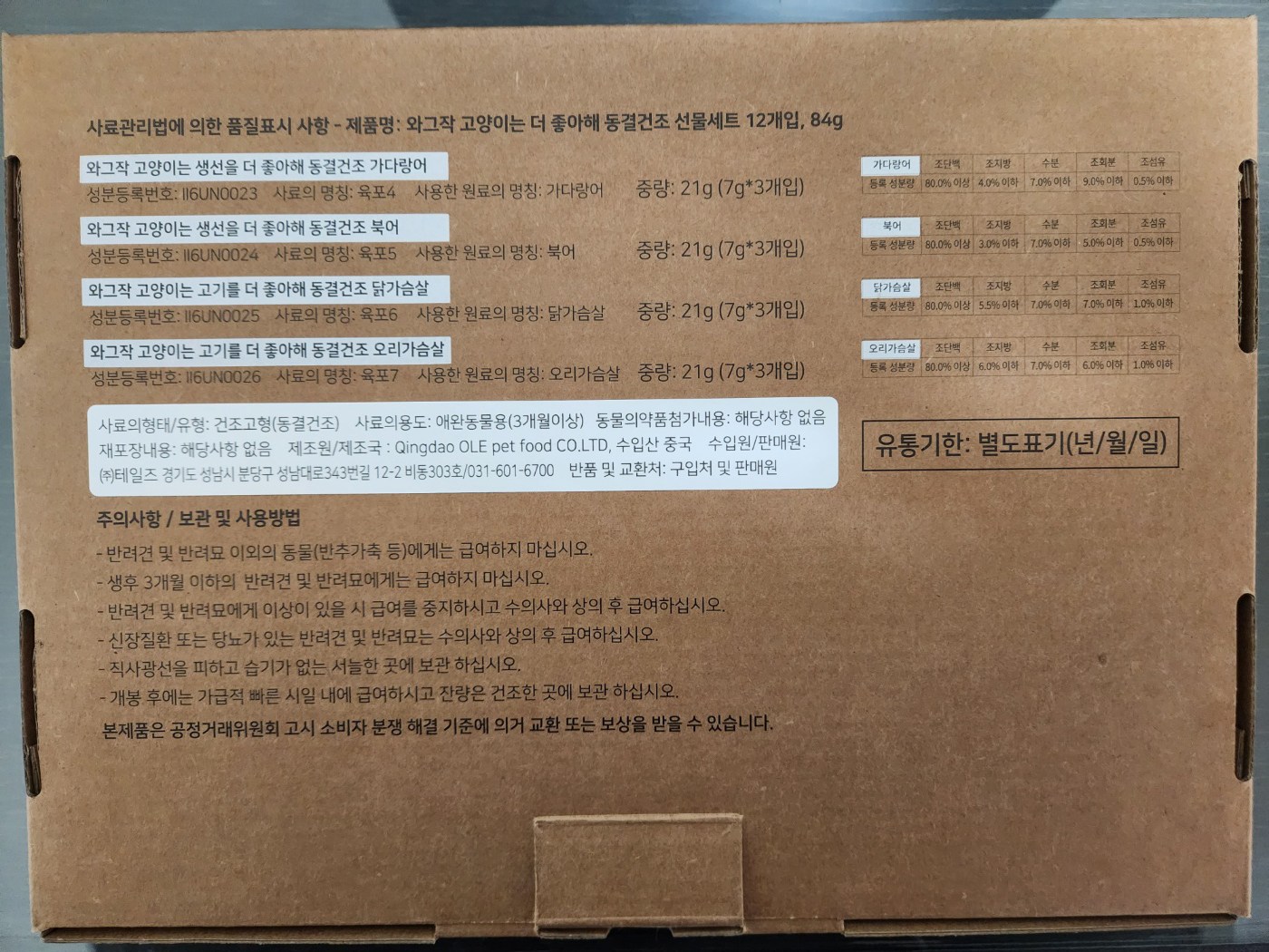 | 품명 및 모델명 | 와그작 고양이는 더 좋아해 동결건조 선물세트 12개입, 84g | 인증/허가 사항 | 사료관리법에 따른 성분등록번호 : 컨텐츠 참조 |