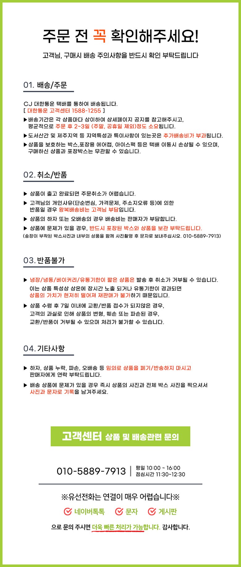 - 상품문의 및 후기게시판을 통해 취소나 환불, 반품 등은 처리되지 않습니다.