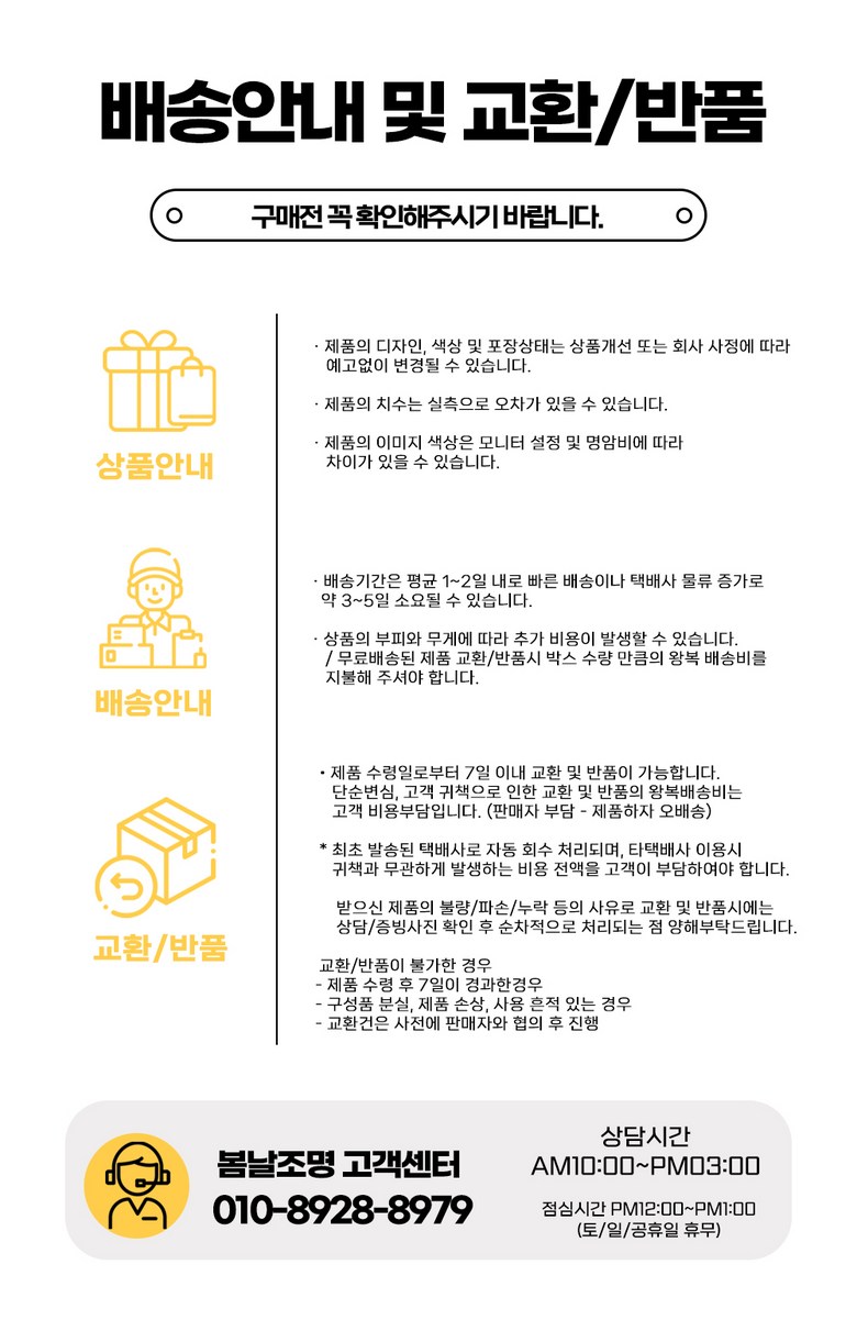 - ㆍ모니터 해상도의 차이로 인해 색상이나 이미지가 실제와 달라, 고객이 단순 변심으로 교환/반품을 무료로 요청하는 경우
