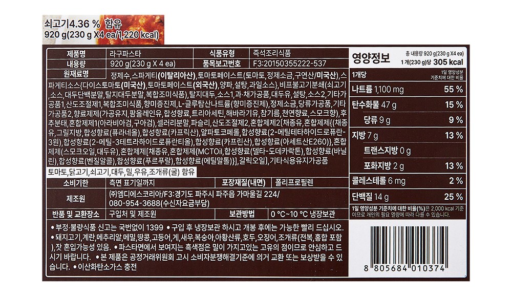 | 제품명 | 라구파스타 | 식품의 유형 | 컨텐츠 참조 |