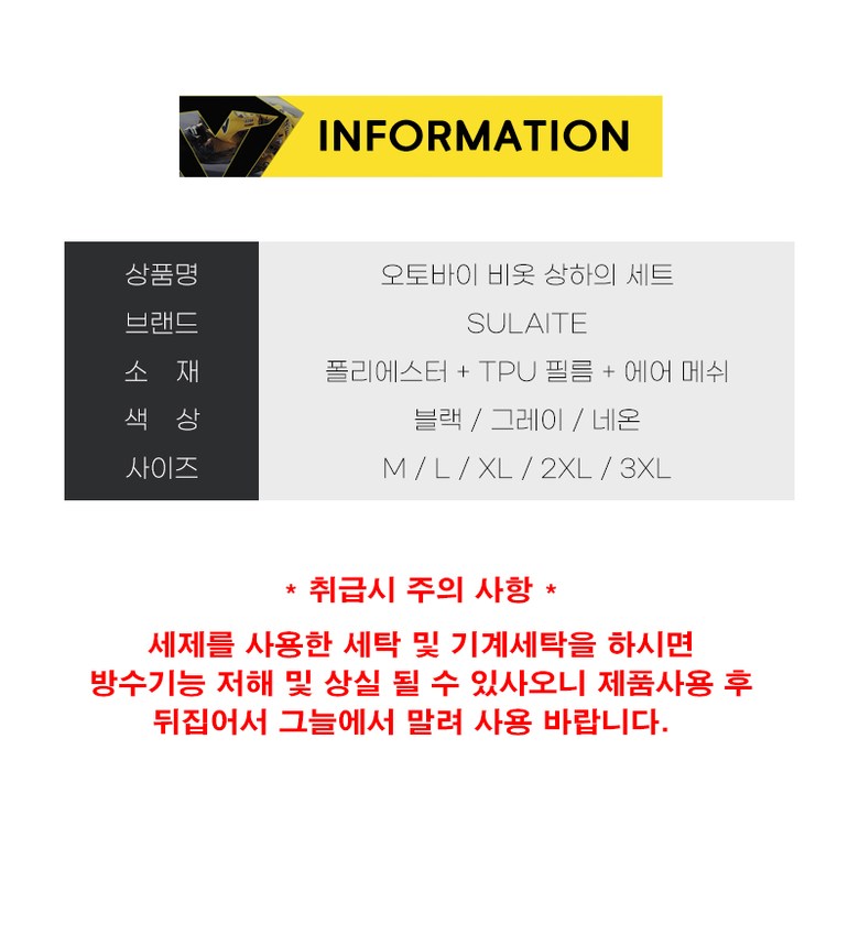 | 치수 | 치수:M, L, XL, 2XL, 3XL | 제조자(수입자) | 제조자:SULAITE / 수입자:비텐 |