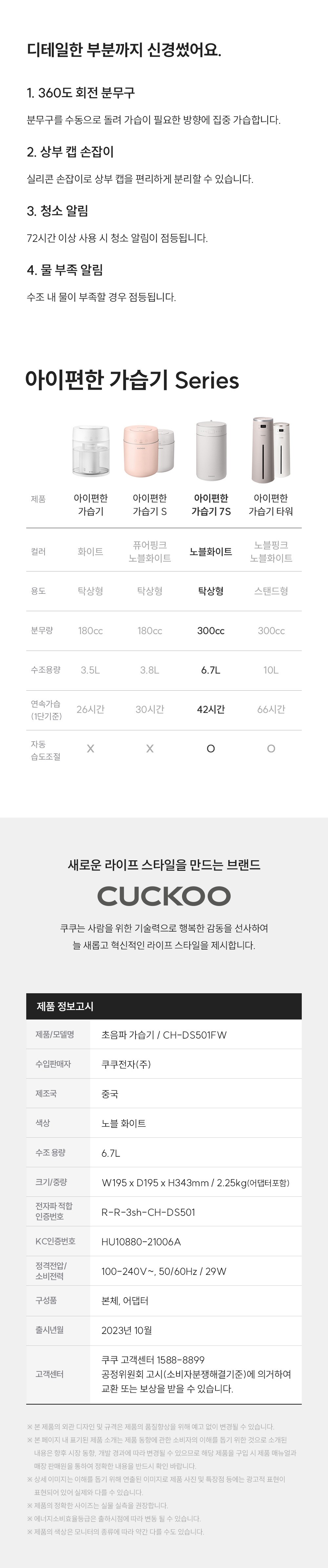 | 품명 및 모델명 | 가습기 / CH-DS501FW | KC 인증정보 | 본품: R-R-3sh-CH-DS501 / 어댑터: HU10880-21006A, R-R-LY2-LY042AHK240175 |