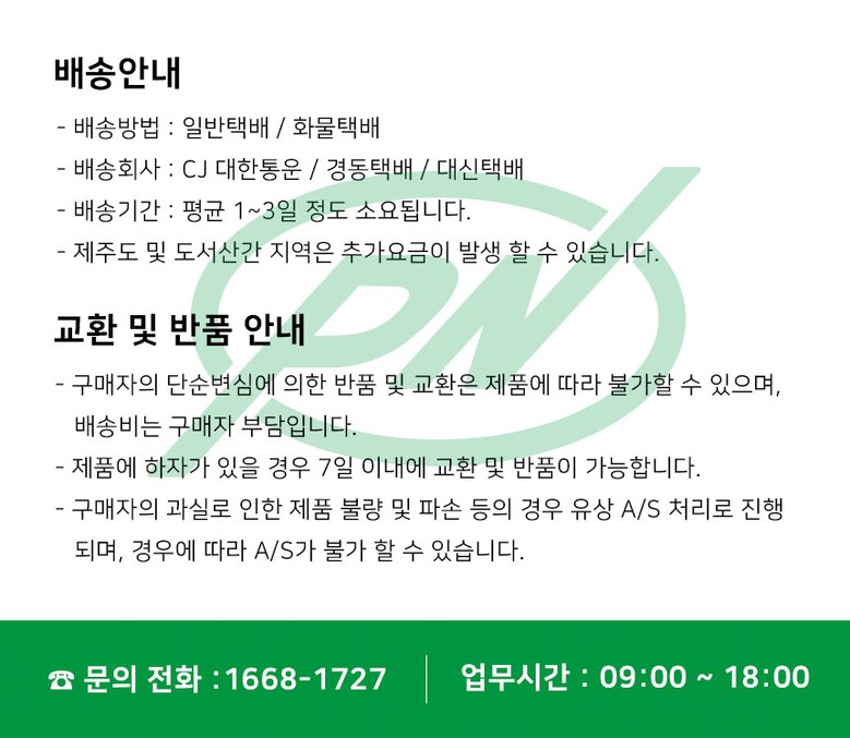 | 배송기간 | ㆍ도서산간 지역 등은 배송에 3-5일이 더 소요될 수 있습니다. - 천재지변, 물량 수급 변동 등 예외적인 사유 발생 시, 다소 지연될 수 있는 점 양해 부탁드립니다. | ||