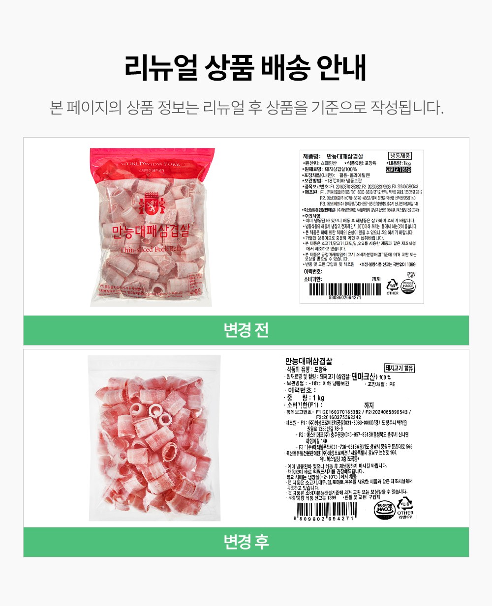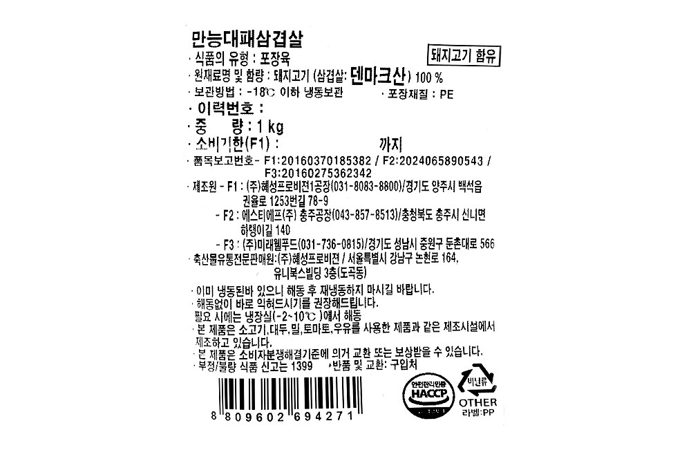| 제조연월일, 소비기한 또는 품질유지기한 | 소비기한(또는 유통기한) : 2027년 01월 02일 이거나 그 이후인 상품 제조년월일 : 2026년 01월 03일 이후인 제조상품 | 세부 품목군별 표시사항 | 축산물 등급표시 : 해당 없음 / 이력번호 표시유무 : 이력번호 표시제품임 |