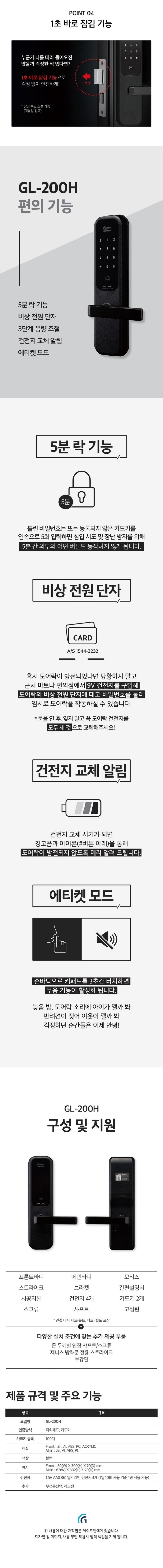 | 품명 및 모델명 | 디지털도어록 / GL-200H | KC 인증정보 | 본품 : KS C 9806 제06-0298호, B223D5003-23026, R-R-UHT-7100S / 건전지 : B052R1059-19002 |