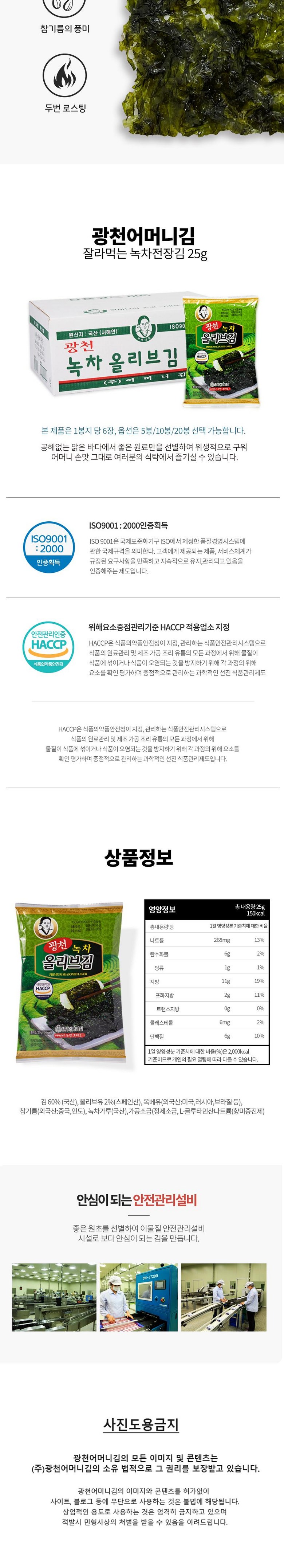 | 품목 또는 명칭 | 광천어머니김 녹차올리브전장김 | 포장단위별 내용물의 용량(중량),수량,크기 | 봉지 당 25g |