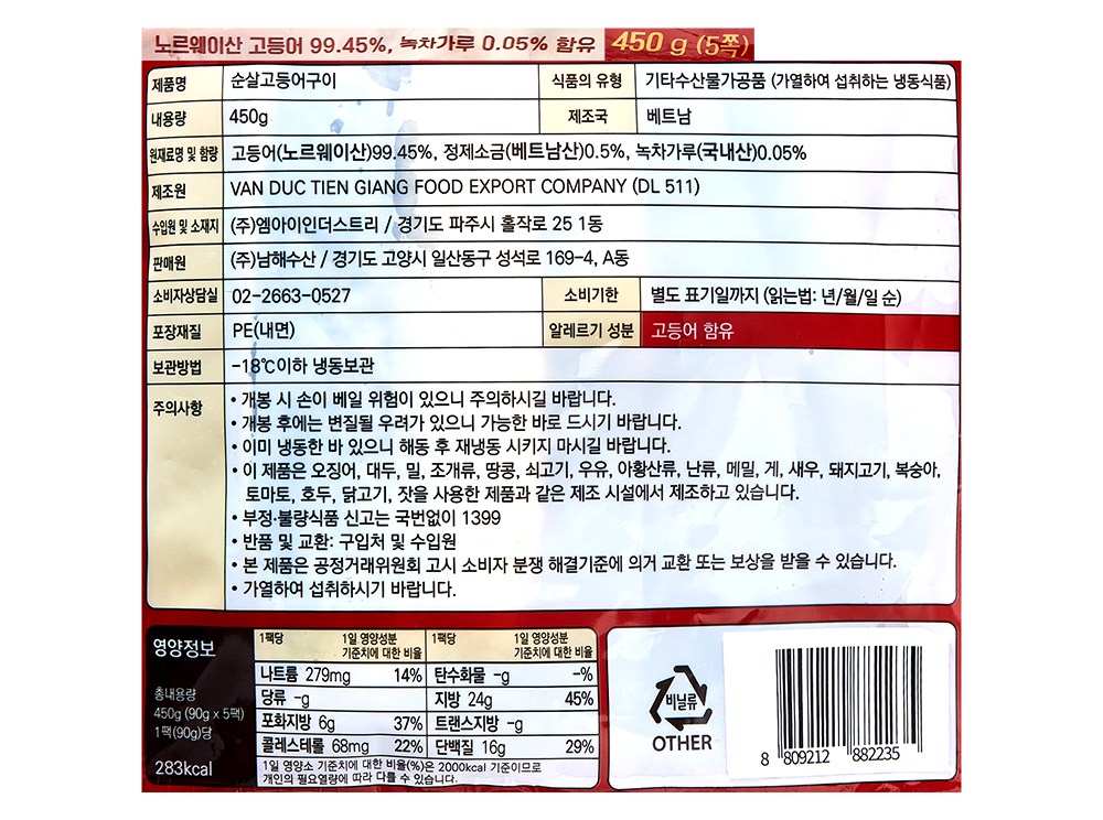 | 포장단위별 내용물의 용량(중량), 수량 | 90g x 5개 | 원재료명 및 함량 | 컨텐츠 참조 |