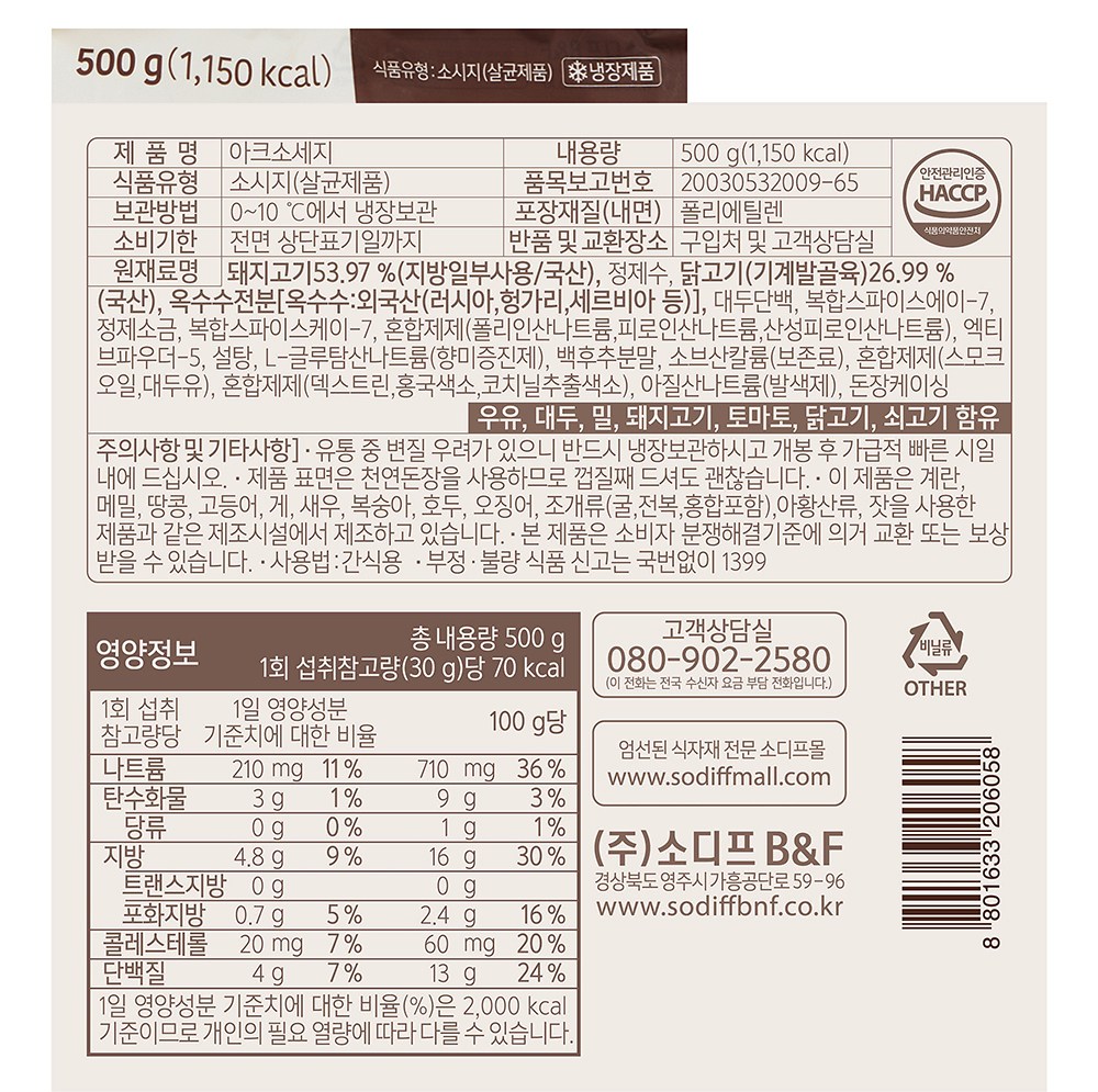 팡 터지는 식감이 재밌는 아크소세지예요. 탱글탱글한 소세지를 한입 베어 물면 고소하고 짭조름한 육즙이 새어 나와 입안을 촉촉하게 적셔준답니다. 두툼한 두께를 보는 것만으로도 만족감이 들 거예요. 그대로 드셔도 좋고, 작게 잘라 볶음밥에 넣어드셔도 좋아요.