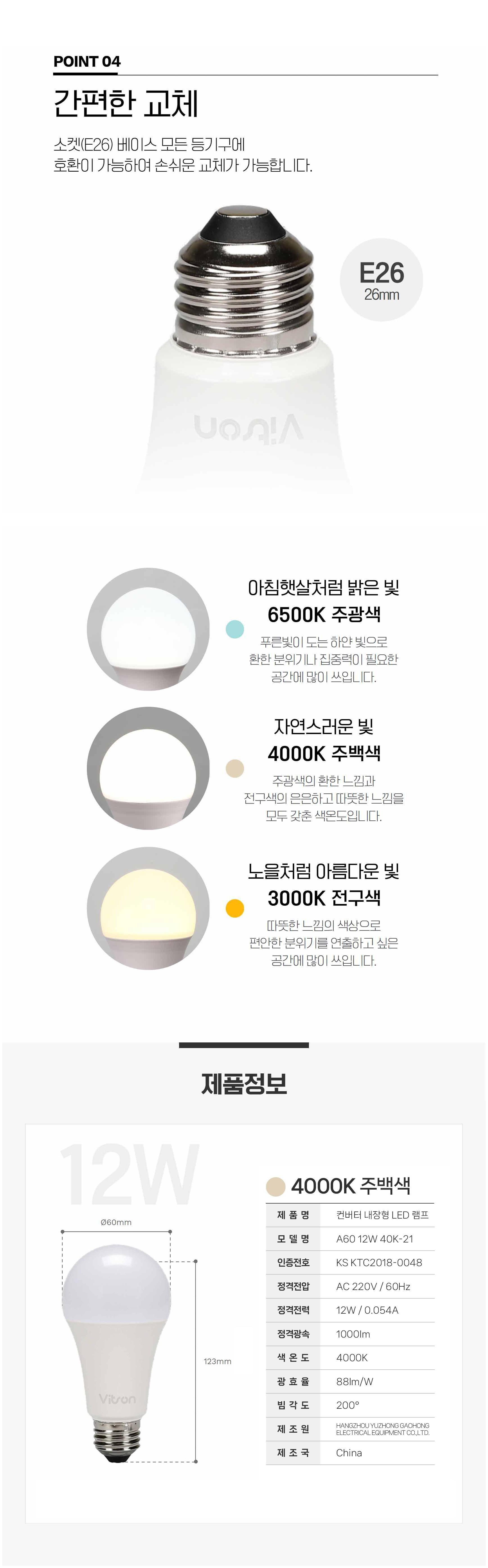 | 품명 및 모델명 | 컨버터 내장형 LED 램프 / A60 12W 40K-21 | KC 인증정보 | KS C 7651 제 KTC2018-0048호, R-R-YZ1-A6012W21 |