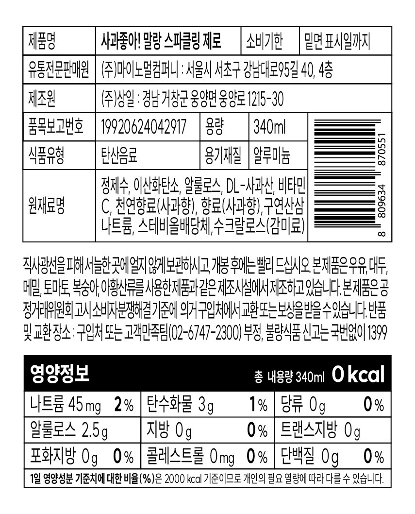 | 포장단위별 내용물의 용량(중량), 수량 | 340ml * 24개 | 원재료명 및 함량 | 컨텐츠 참조 |