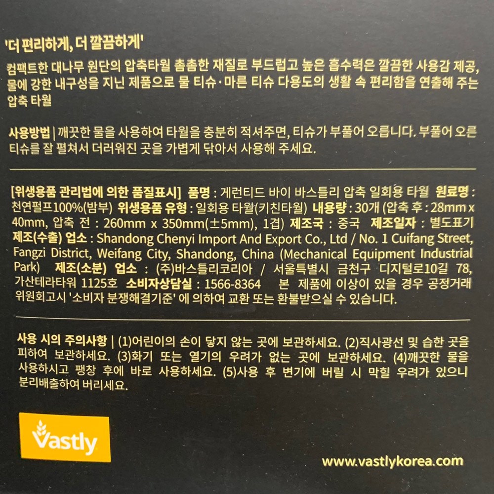 | 제조국(원산지) | 중국 | 제조자(수입자) | Shandong Chemyi Import And Export Co., Ltd / (주)바스틀리코리아 |