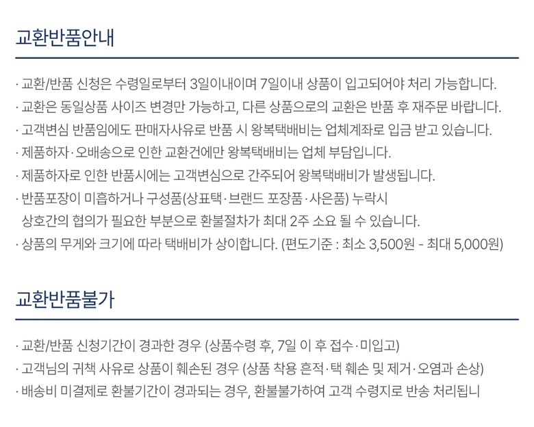 | 교환/반품 비용 (왕복비용) | 9,000원 - 단, 고객 변심의 경우에만 발생 - 도서산간 및 일부 지역 추가비용 발생 |