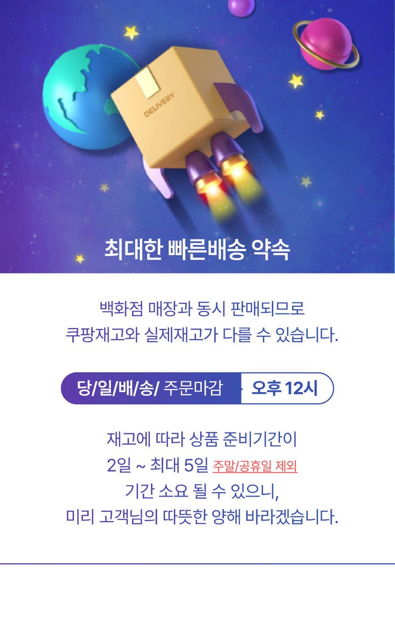| 배송기간 | ㆍ도서산간 지역 등은 배송에 3-5일이 더 소요될 수 있습니다. - 천재지변, 물량 수급 변동 등 예외적인 사유 발생 시, 다소 지연될 수 있는 점 양해 부탁드립니다. | ||