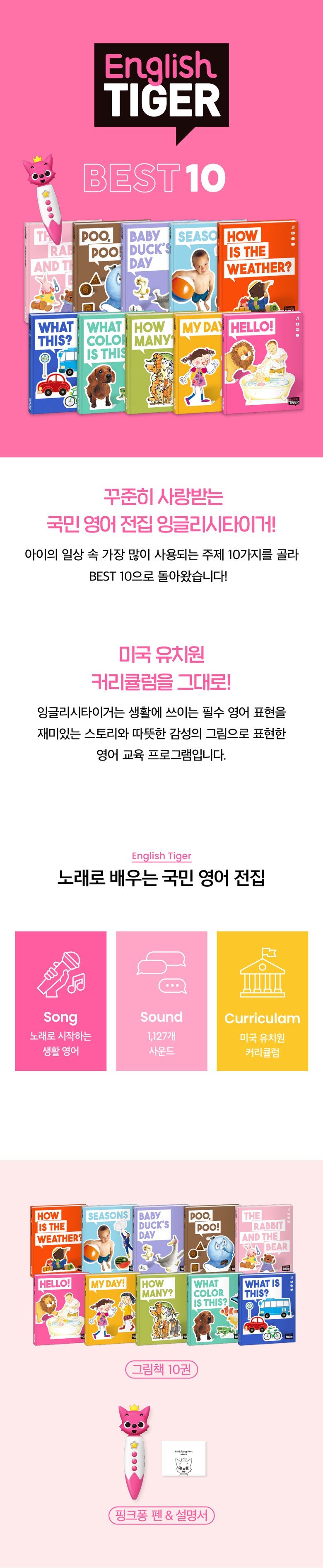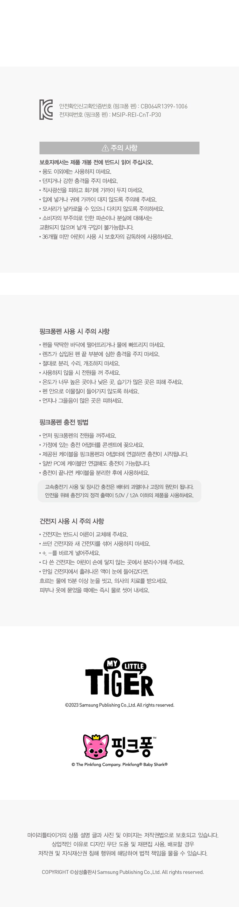| 품명 및 모델명 | 잉글리시타이거 베스트 10 핑크퐁펜 영어소전집 / P30 | KC 인증정보 | 책 세트 : 유/KC마크 / 핑크퐁펜 : CB064R1399-1006, MSIP-REI-CnT-P30 |