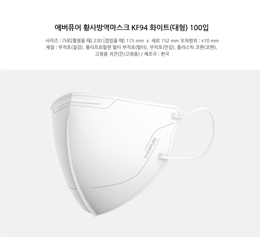 | 품명 및 모델명 | 에버퓨어황사방역마스크(KF94)(대형)(흰색) | 인증/허가 사항 | 의약외품 |