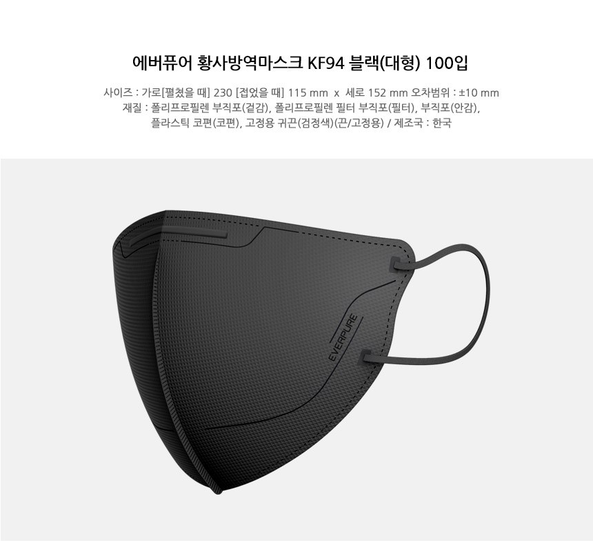 | 품명 및 모델명 | 에버퓨어황사방역마스크(KF94)(대형)(검정색) | 인증/허가 사항 | 의약외품 |