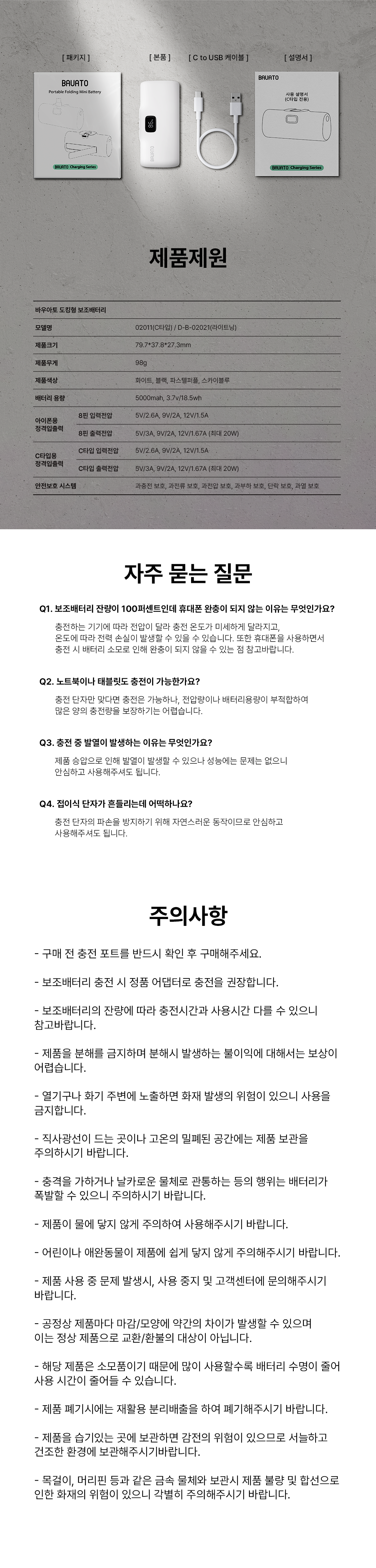 | 품명 및 모델명 | 바우아토 고속 충전 미니 보조배터리(C타입) / D-B-02015 | KC 인증정보 | ZU101562-23009C |