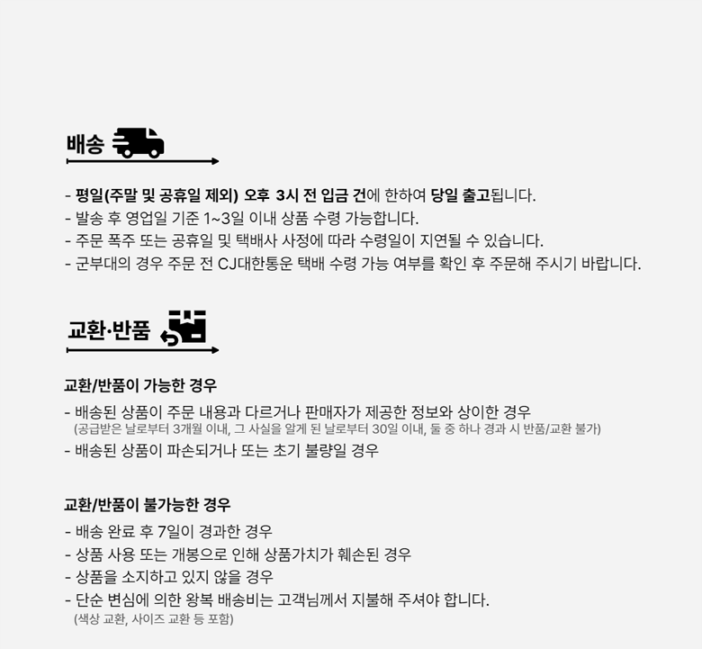 - ㆍ교환/반품에 관한 일반적인 사항은 판매자가 제시사항보다 관계법령이 우선합니다.