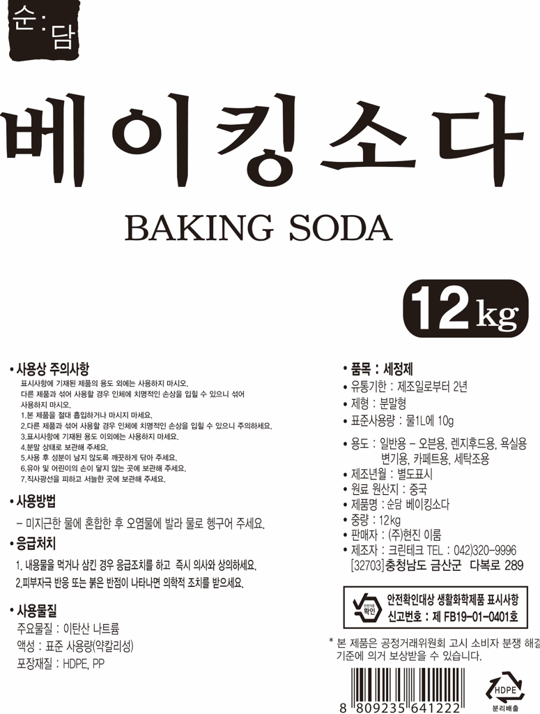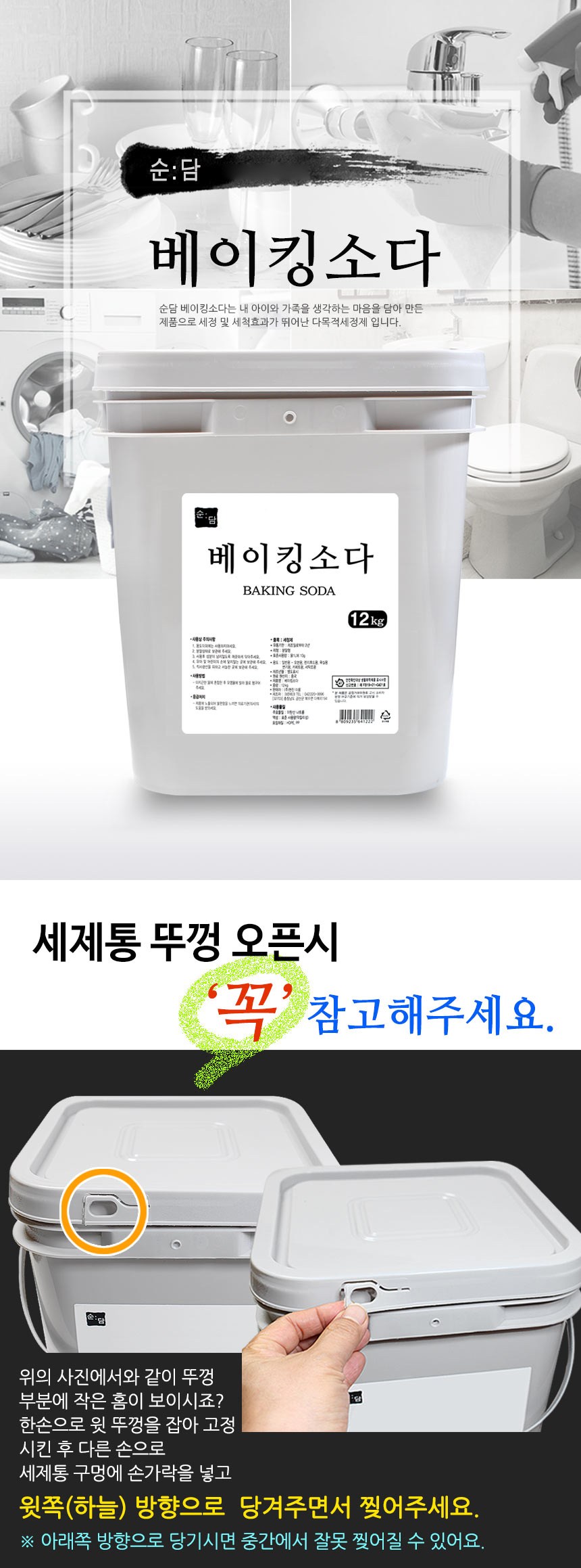 | 품목 및 제품명 | 세정제 / 순담 베이킹소다 | 용도(표백제의 경우 계열을 함께표시) 및 제형 | 일반용:오븐용,렌지후드용,욕실용,변기용,카페트용,세탁조용 / 분말형 |