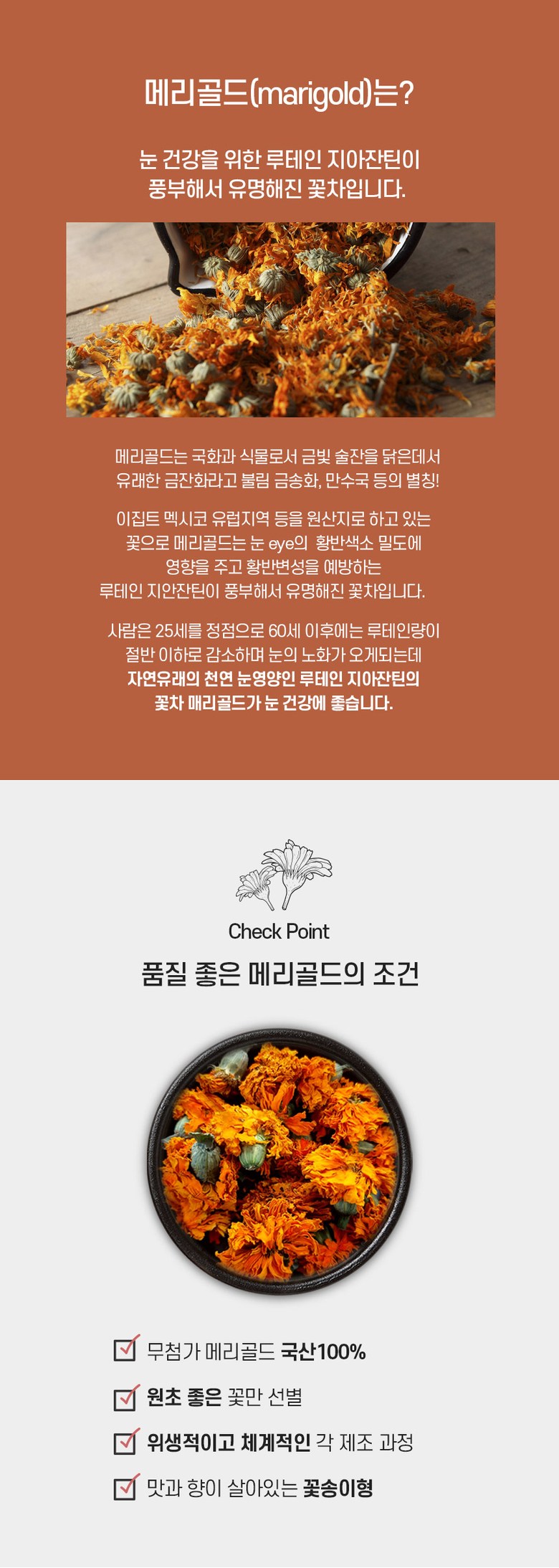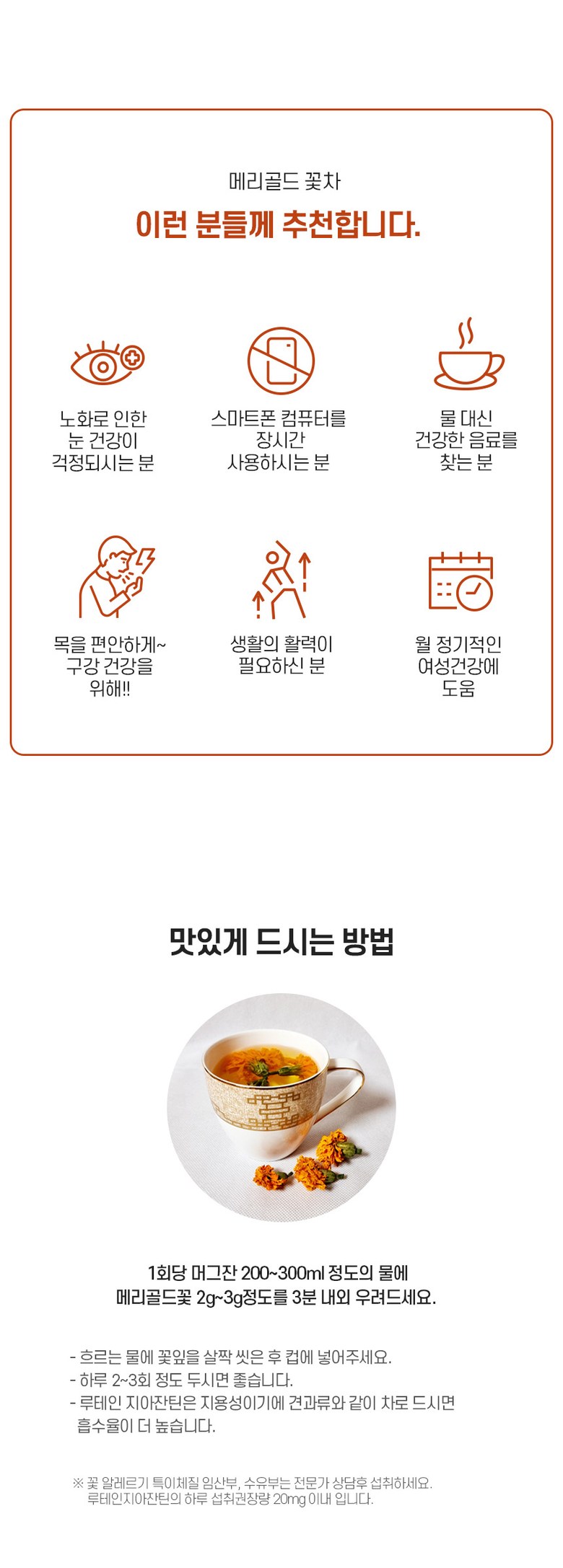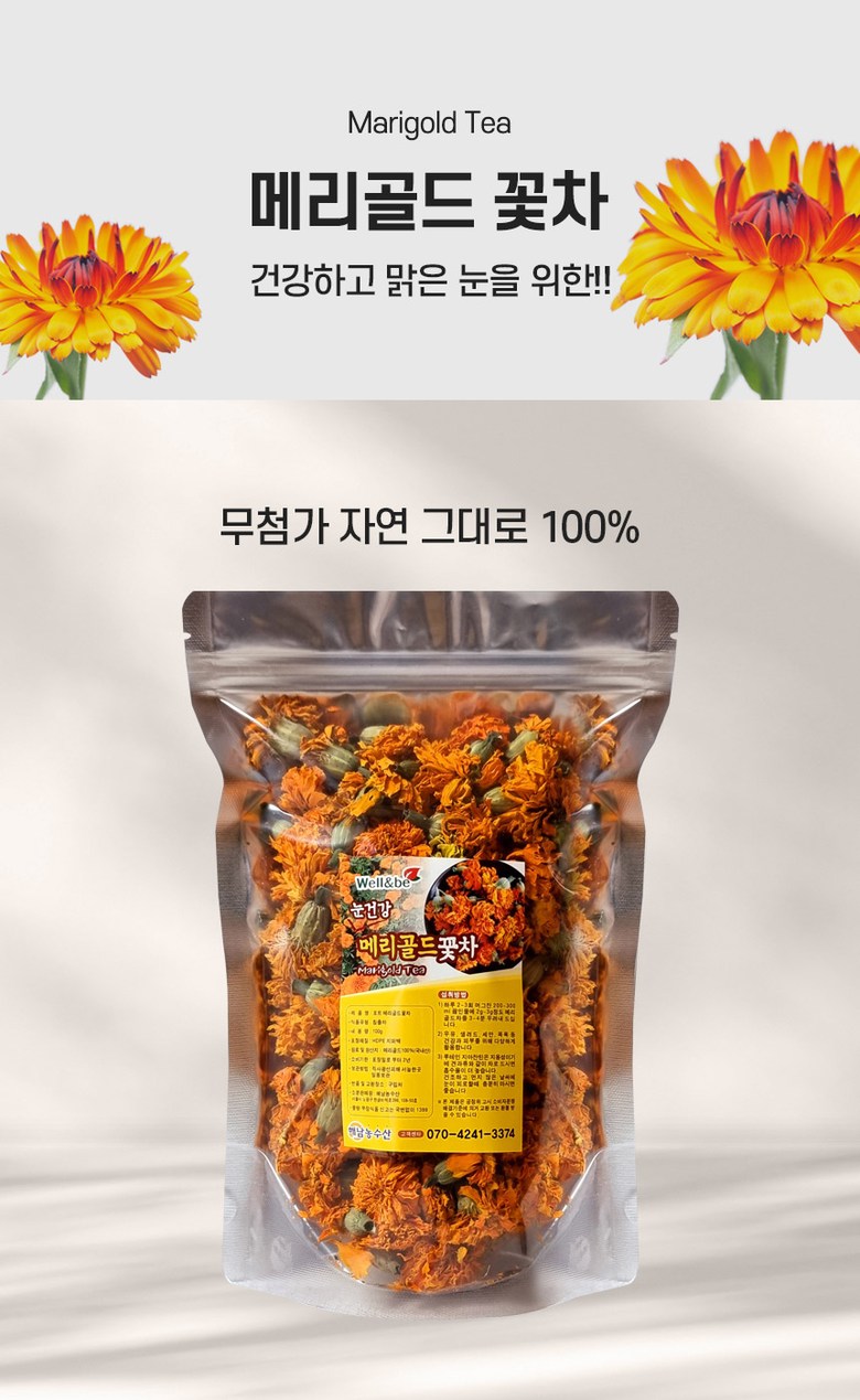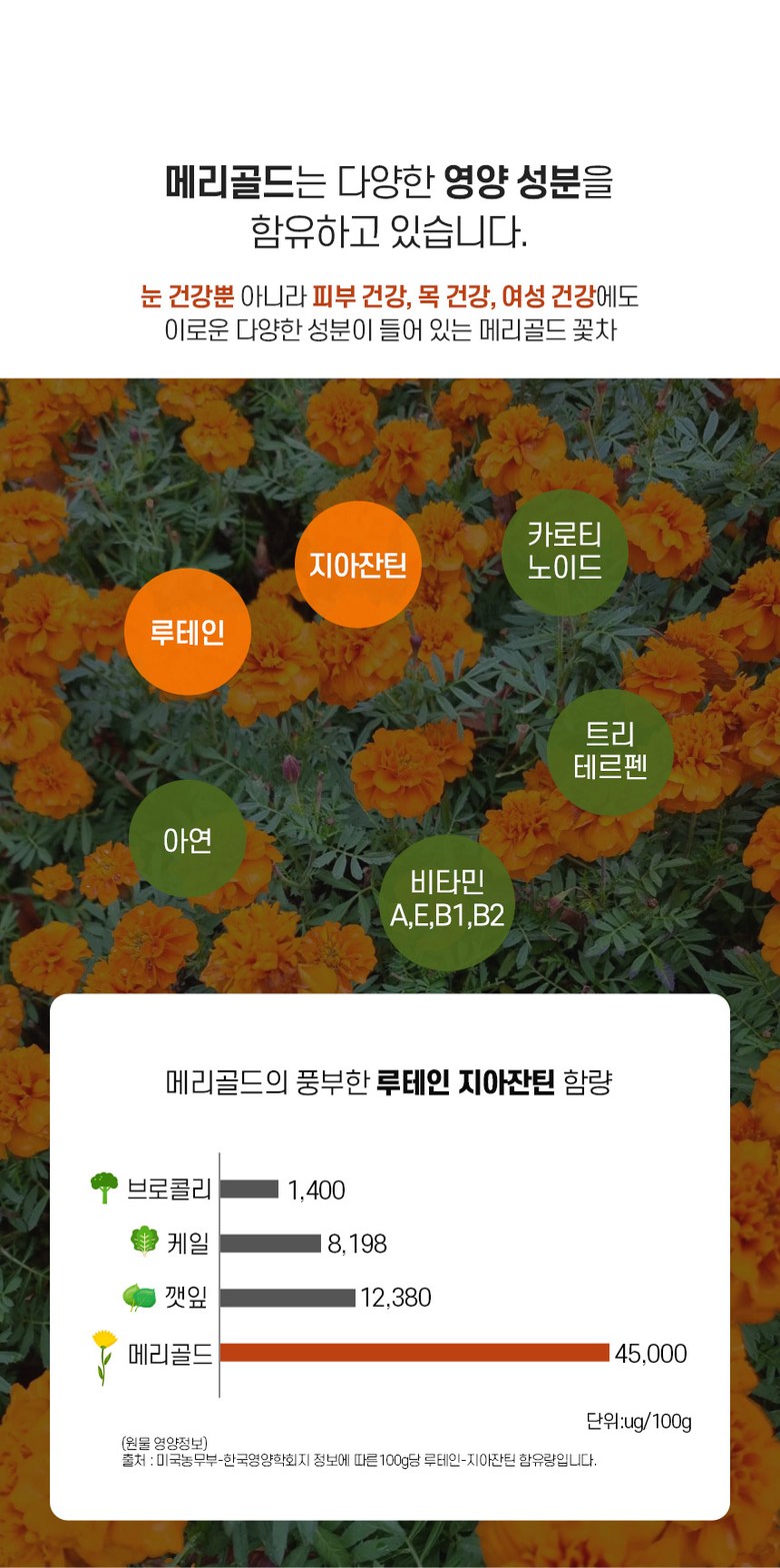 메리골드차는 루테인 지아잔틴이 풍부하여 눈건강에 아주 이롭습니다. 원초좋은 꽃을 선별한 무첨가 순 꽃차입니다. 눈영양 눈건강 시력보호가 필요한 사람. 노화로 시력이 약해진 사람 피부건강 여성건강 에도 아주 이로운 허브차 입니다. 청정지역 제주에서 최적의 환경에서 자란 신선하고 유용성분이 풍부한 프리미엄 메리골드 마리골드 꽃차 꽃송이 입니다.