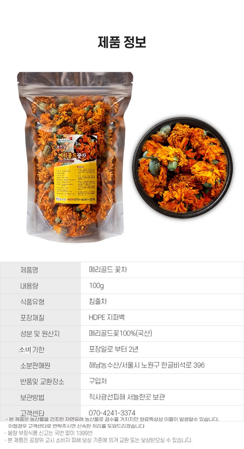 | 품목 또는 명칭 | 메리골드꽃차 | 포장단위별 내용물의 용량(중량),수량,크기 | 100g,1개,2개 |