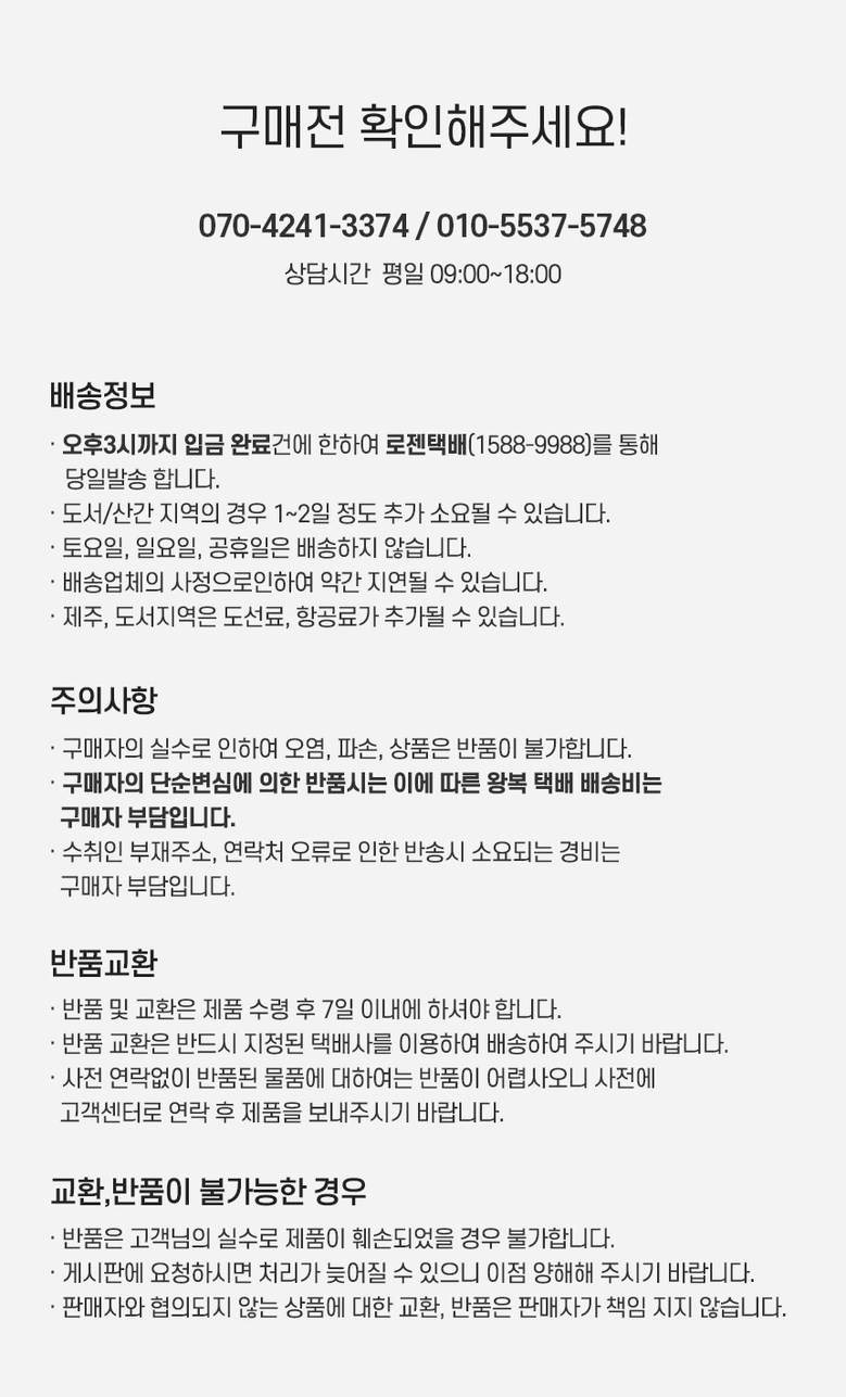 - ㆍ모니터 해상도의 차이로 인해 색상이나 이미지가 실제와 달라, 고객이 단순 변심으로 교환/반품을 무료로 요청하는 경우