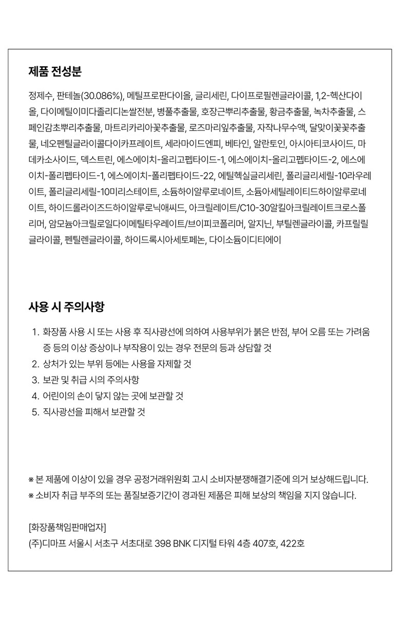 | 화장품제조업자, 화장품책임판매업자 및 맞춤형화장품판매업자 | 화장품제조업자: 쵸이스코스메틱화장품책임판매업자: 주식회사 디마프 / 서울 서초구 서초대로 398 BNK타워 422호 | 제조국 | 대한민국 |
