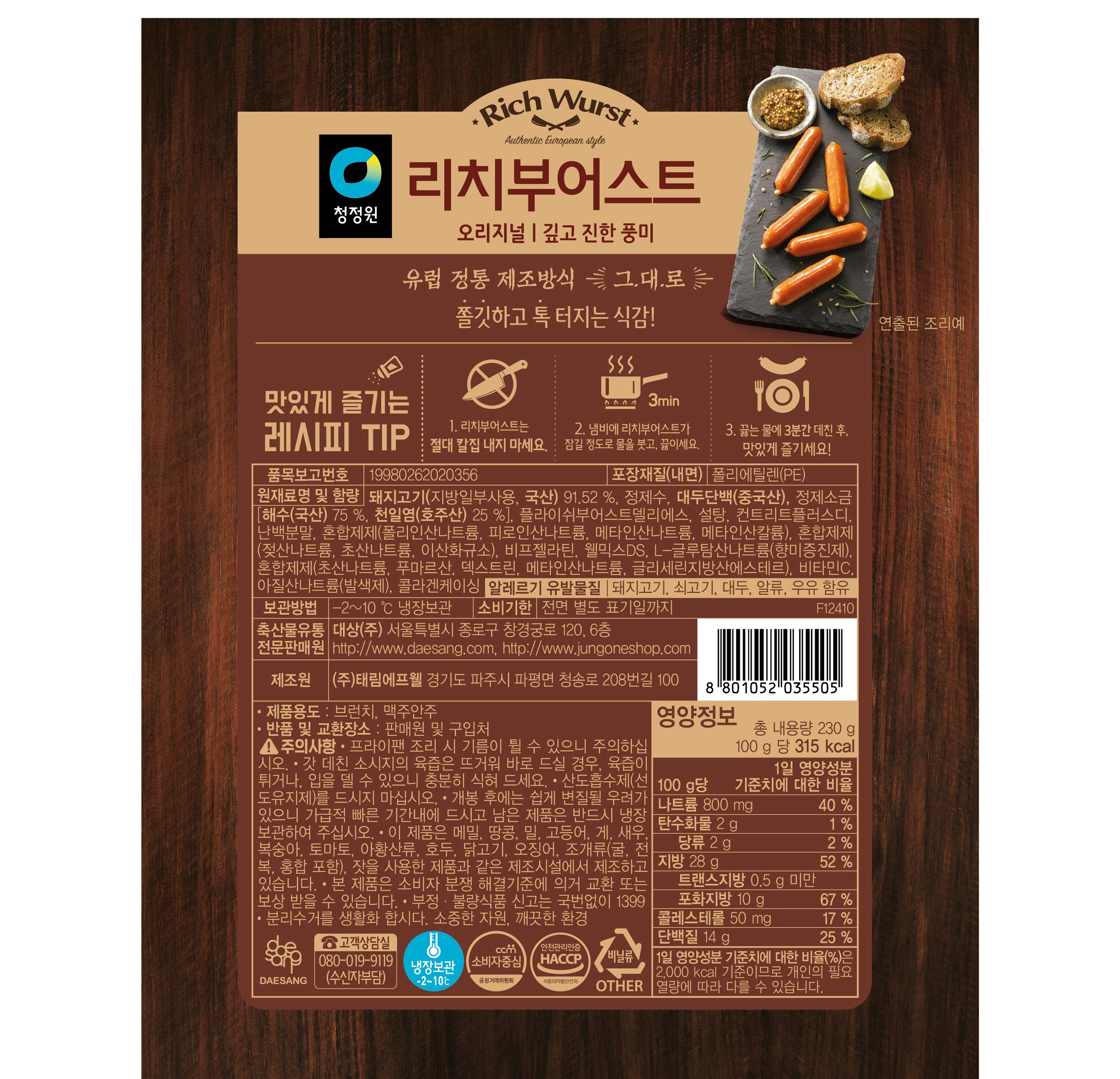 | 제품명 | 청정원 리치부어스트 | 식품의 유형 | 컨텐츠 참조 |